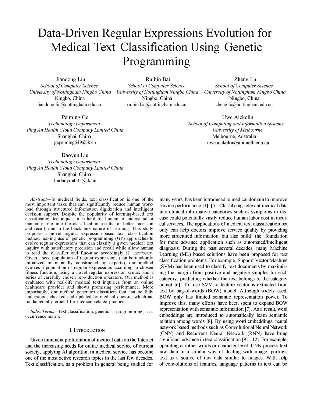 In medical fields, text classification is one of the most important tasks that can significantly reduce human workload through structured information digitization and intelligent decision support. Despite the popularity of learning-based text classification techniques, it is hard for human to understand or manually fine-tune the classification results for better precision and recall, due to the black box nature of learning. This study proposes a novel regular expression-based text classification method making use of genetic programming (GP) approaches to evolve regular expressions that can classify a given medical text inquiry with satisfactory precision and recall while allow human to read the classifier and fine-tune accordingly if necessary. Given a seed population of regular expressions (can be randomly initialized or manually constructed by experts), our method evolves a population of regular expressions according to chosen fitness function, using a novel regular expression syntax and a series of carefully chosen reproduction operators. Our method is evaluated with real-life medical text inquiries from an online healthcare provider and shows promising performance. More importantly, our method generates classifiers that can be fully understood, checked and updated by medical doctors, which are fundamentally crucial for medical related practices.