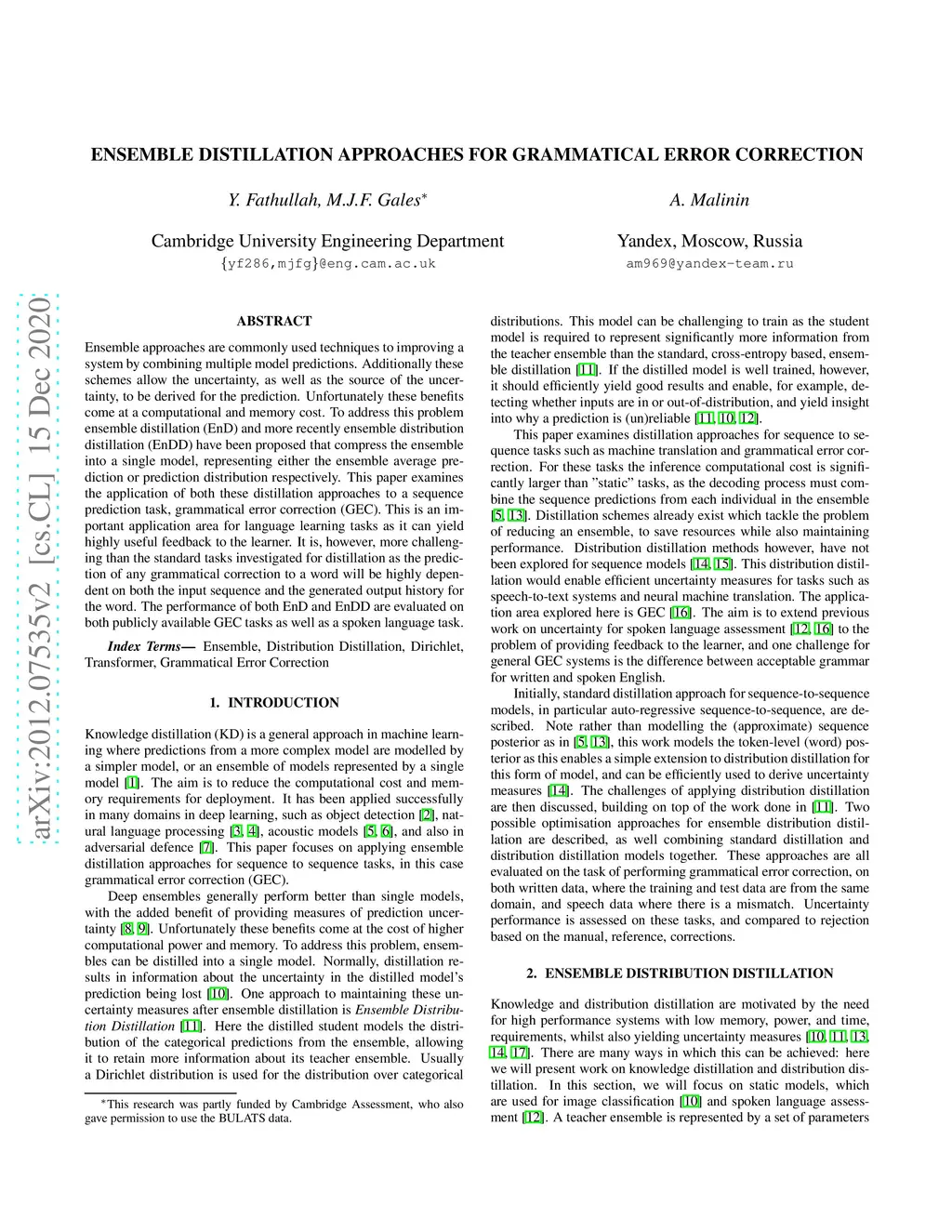 Ensemble Distillation Approaches for Grammatical Error Correction