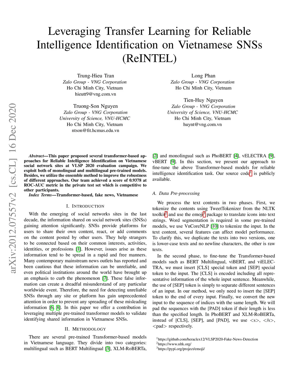 This paper proposed several transformer-based approaches for Reliable Intelligence Identification on Vietnamese social network sites at VLSP 2020 evaluation campaign. We exploit both of monolingual and multilingual pre-trained models. Besides, we utilize the ensemble method to improve the robustness of different approaches. Our team achieved a score of 0.9378 at ROC-AUC metric in the private test set which is competitive to other participants.
