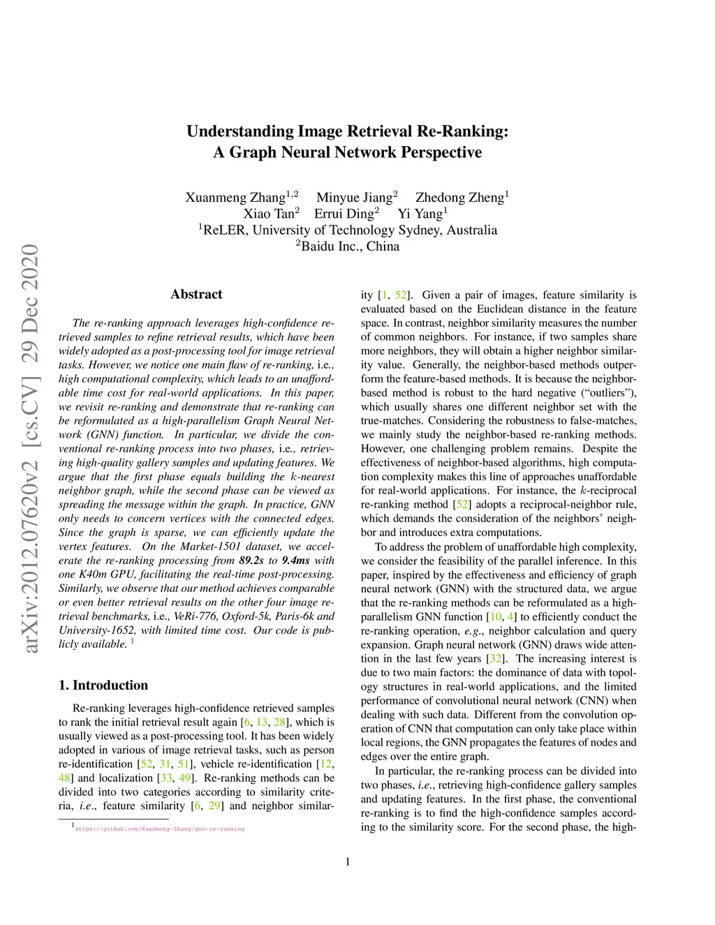 The re-ranking approach leverages high-confidence retrieved samples to refine retrieval results, which have been widely adopted as a post-processing tool for image retrieval tasks. However, we notice one main flaw of re-ranking, i.e., high computational complexity, which leads to an unaffordable time cost for real-world applications. In this paper, we revisit re-ranking and demonstrate that re-ranking can be reformulated as a high-parallelism Graph Neural Network (GNN) function. In particular, we divide the conventional re-ranking process into two phases, i.e., retrieving high-quality gallery samples and updating features. We argue that the first phase equals building the k-nearest neighbor graph, while the second phase can be viewed as spreading the message within the graph. In practice, GNN only needs to concern vertices with the connected edges. Since the graph is sparse, we can efficiently update the vertex features. On the Market-1501 dataset, we accelerate the re-ranking processing from 89.2s to 9.4ms with one K40m GPU, facilitating the real-time post-processing. Similarly, we observe that our method achieves comparable or even better retrieval results on the other four image retrieval benchmarks, i.e., VeRi-776, Oxford-5k, Paris-6k and University-1652, with limited time cost. Our code is publicly available.