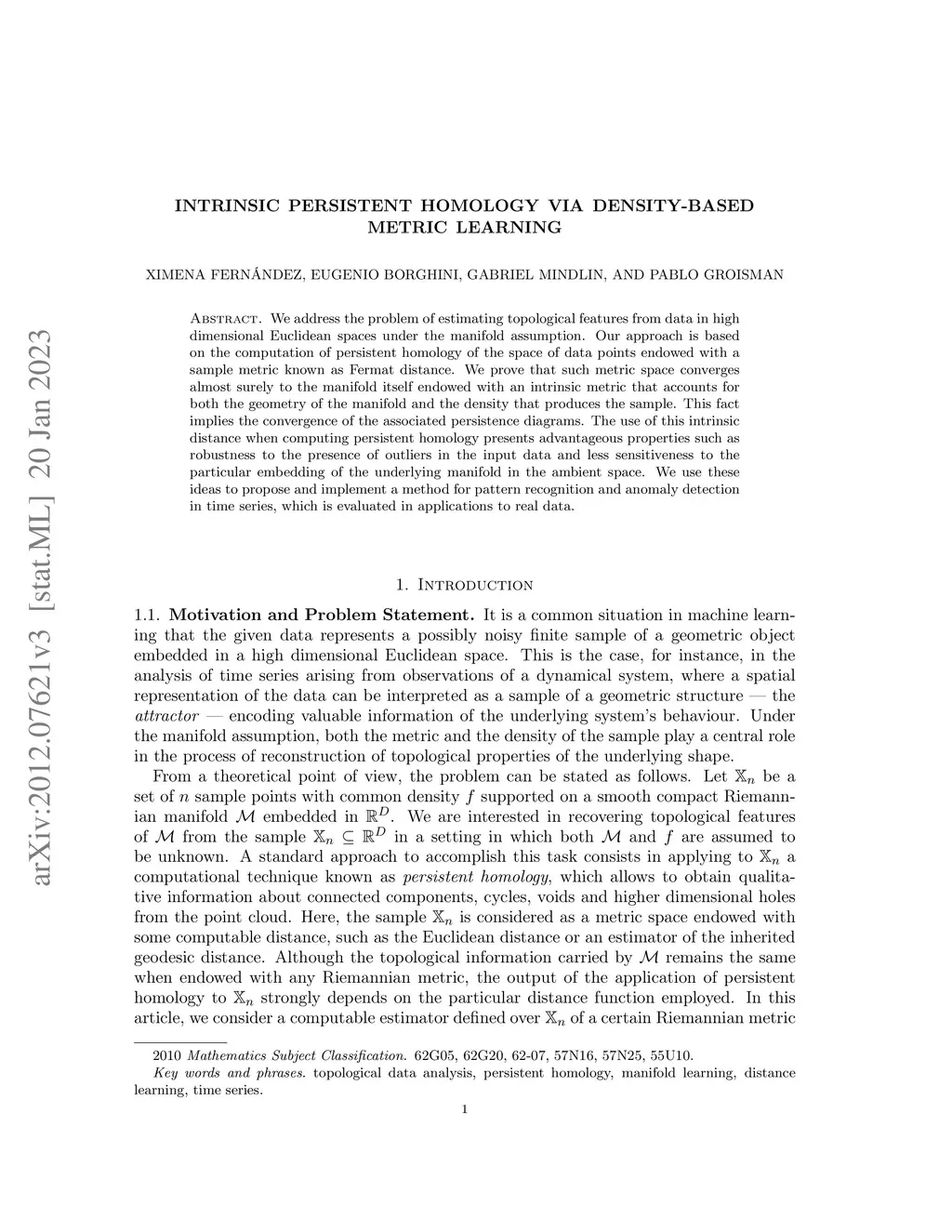 We address the problem of estimating topological features from data in high dimensional Euclidean spaces under the manifold assumption. Our approach is based on the computation of persistent homology of the space of data points endowed with a sample metric known as Fermat distance. We prove that such metric space converges almost surely to the manifold itself endowed with an intrinsic metric that accounts for both the geometry of the manifold and the density that produces the sample. This fact implies the convergence of the associated persistence diagrams. The use of this intrinsic distance when computing persistent homology presents advantageous properties such as robustness to the presence of outliers in the input data and less sensitiveness to the particular embedding of the underlying manifold in the ambient space. We use these ideas to propose and implement a method for pattern recognition and anomaly detection in time series, which is evaluated in applications to real data.