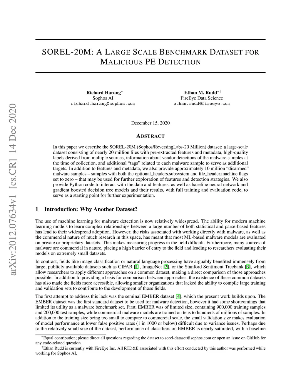 SOREL-20M: A Large Scale Benchmark Dataset for Malicious PE Detection