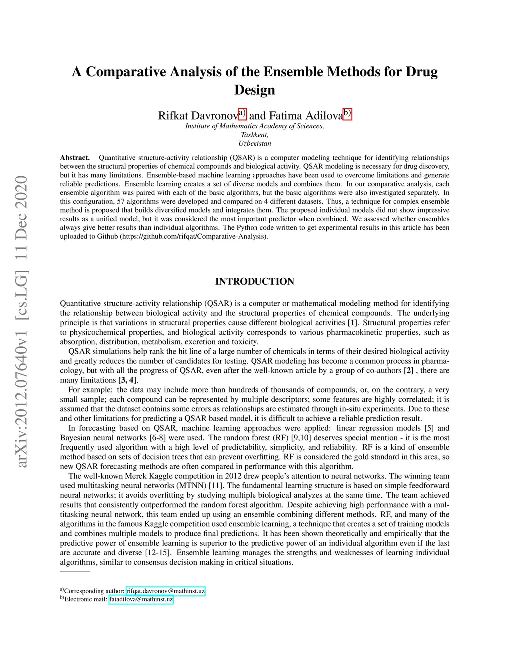 Quantitative structure-activity relationship (QSAR) is a computer modeling technique for identifying relationships between the structural properties of chemical compounds and biological activity. QSAR modeling is necessary for drug discovery, but it has many limitations. Ensemble-based machine learning approaches have been used to overcome limitations and generate reliable predictions. Ensemble learning creates a set of diverse models and combines them. In our comparative analysis, each ensemble algorithm was paired with each of the basic algorithms, but the basic algorithms were also investigated separately. In this configuration, 57 algorithms were developed and compared on 4 different datasets. Thus, a technique for complex ensemble method is proposed that builds diversified models and integrates them. The proposed individual models did not show impressive results as a unified model, but it was considered the most important predictor when combined. We assessed whether ensembles always give better results than individual algorithms. The Python code written to get experimental results in this article has been uploaded to Github (https://github.com/rifqat/Comparative-Analysis).