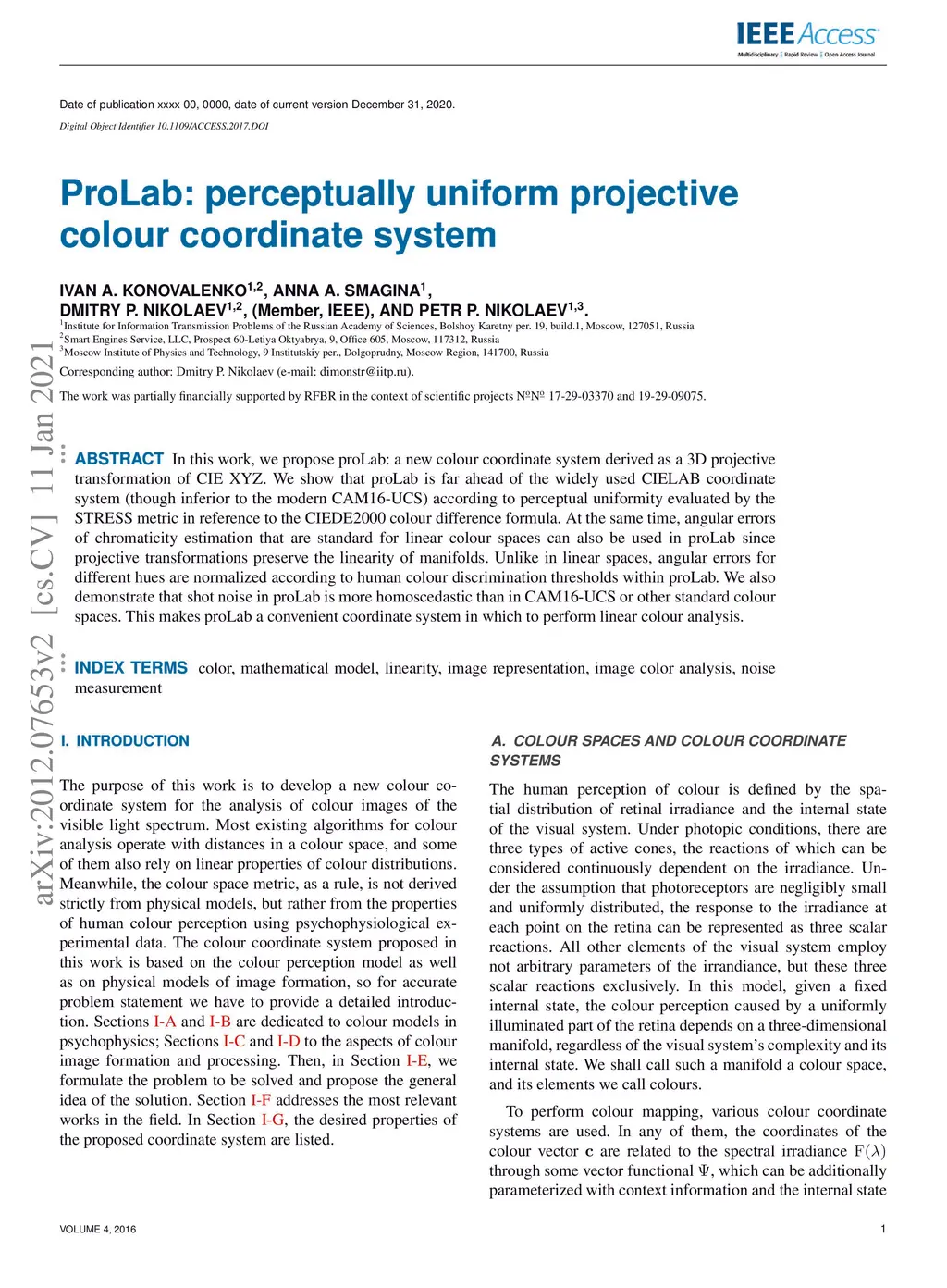 In this work, we propose proLab: a new colour coordinate system derived as a 3D projective transformation of CIE XYZ. We show that proLab is far ahead of the widely used CIELAB coordinate system (though inferior to the modern CAM16-UCS) according to perceptual uniformity evaluated by the STRESS metric in reference to the CIEDE2000 colour difference formula. At the same time, angular errors of chromaticity estimation that are standard for linear colour spaces can also be used in proLab since projective transformations preserve the linearity of manifolds. Unlike in linear spaces, angular errors for different hues are normalized according to human colour discrimination thresholds within proLab. We also demonstrate that shot noise in proLab is more homoscedastic than in CAM16-UCS or other standard colour spaces. This makes proLab a convenient coordinate system in which to perform linear colour analysis.