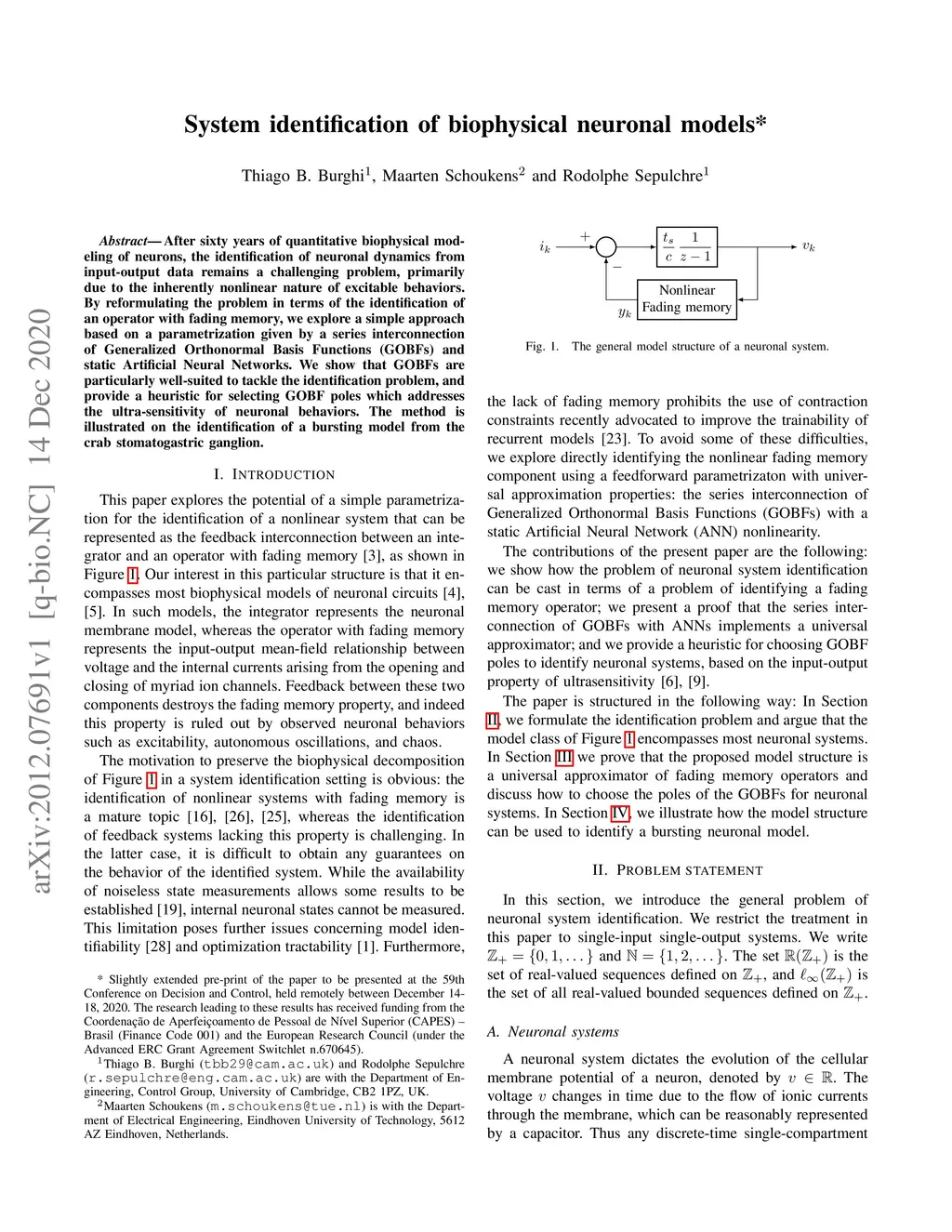 After sixty years of quantitative biophysical modeling of neurons, the identification of neuronal dynamics from input-output data remains a challenging problem, primarily due to the inherently nonlinear nature of excitable behaviors. By reformulating the problem in terms of the identification of an operator with fading memory, we explore a simple approach based on a parametrization given by a series interconnection of Generalized Orthonormal Basis Functions (GOBFs) and static Artificial Neural Networks. We show that GOBFs are particularly well-suited to tackle the identification problem, and provide a heuristic for selecting GOBF poles which addresses the ultra-sensitivity of neuronal behaviors. The method is illustrated on the identification of a bursting model from the crab stomatogastric ganglion.