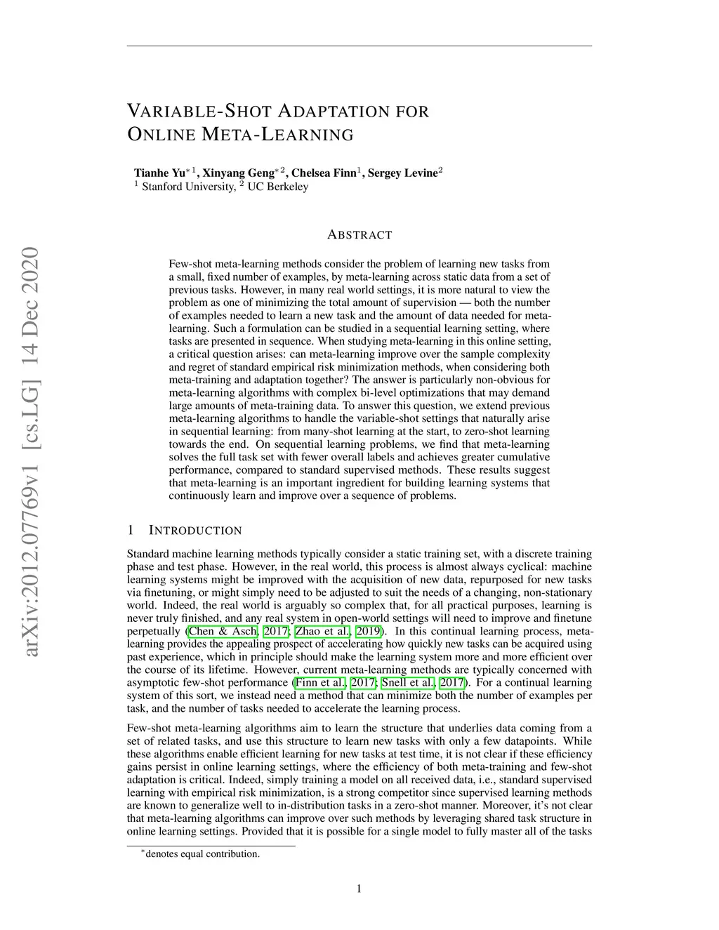 Few-shot meta-learning methods consider the problem of learning new tasks from a small, fixed number of examples, by meta-learning across static data from a set of previous tasks. However, in many real world settings, it is more natural to view the problem as one of minimizing the total amount of supervision --- both the number of examples needed to learn a new task and the amount of data needed for meta-learning. Such a formulation can be studied in a sequential learning setting, where tasks are presented in sequence. When studying meta-learning in this online setting, a critical question arises: can meta-learning improve over the sample complexity and regret of standard empirical risk minimization methods, when considering both meta-training and adaptation together? The answer is particularly non-obvious for meta-learning algorithms with complex bi-level optimizations that may demand large amounts of meta-training data. To answer this question, we extend previous meta-learning algorithms to handle the variable-shot settings that naturally arise in sequential learning: from many-shot learning at the start, to zero-shot learning towards the end. On sequential learning problems, we find that meta-learning solves the full task set with fewer overall labels and achieves greater cumulative performance, compared to standard supervised methods. These results suggest that meta-learning is an important ingredient for building learning systems that continuously learn and improve over a sequence of problems.