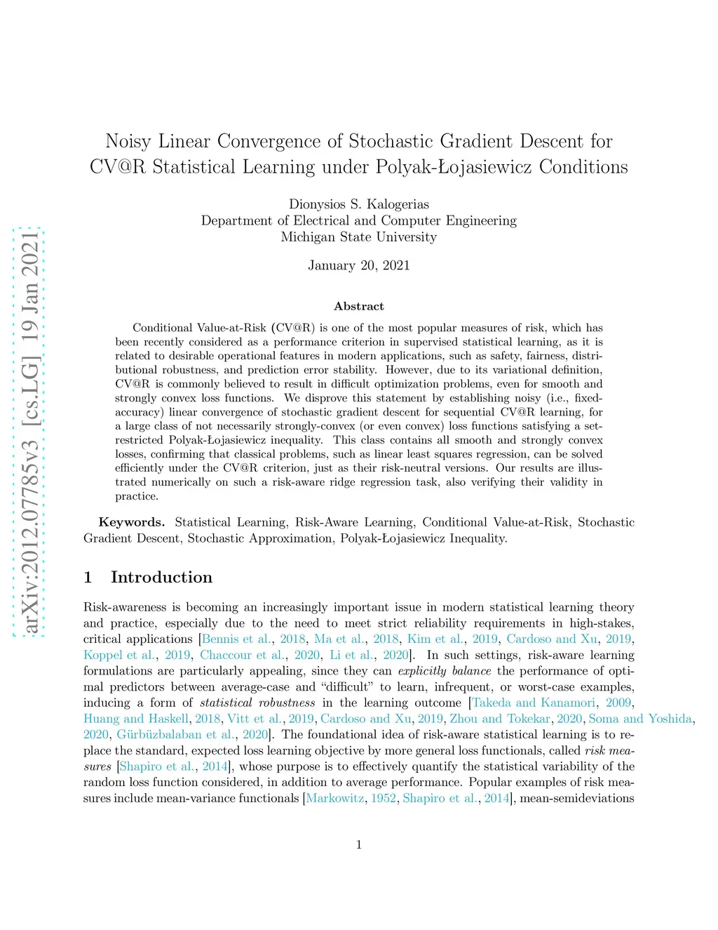 Conditional Value-at-Risk () is one of the most popular measures of risk, which has been recently considered as a performance criterion in supervised statistical learning, as it is related to desirable operational features in modern applications, such as safety, fairness, distributional robustness, and prediction error stability. However, due to its variational definition, is commonly believed to result in difficult optimization problems, even for smooth and strongly convex loss functions. We disprove this statement by establishing noisy (i.e., fixed-accuracy) linear convergence of stochastic gradient descent for sequential learning, for a large class of not necessarily strongly-convex (or even convex) loss functions satisfying a set-restricted Polyak-Lojasiewicz inequality. This class contains all smooth and strongly convex losses, confirming that classical problems, such as linear least squares regression, can be solved efficiently under the criterion, just as their risk-neutral versions. Our results are illustrated numerically on such a risk-aware ridge regression task, also verifying their validity in practice.