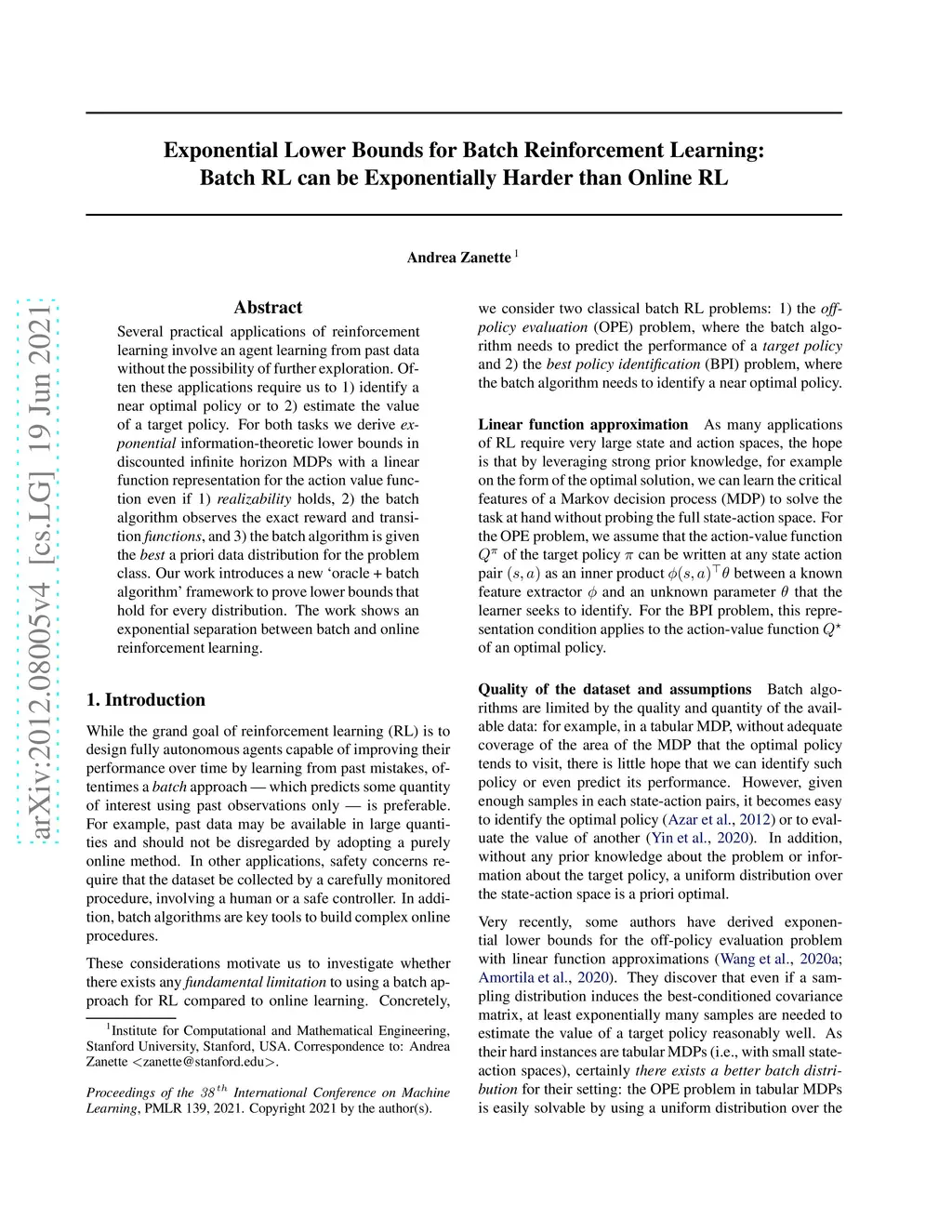 Several practical applications of reinforcement learning involve an agent learning from past data without the possibility of further exploration. Often these applications require us to 1) identify a near optimal policy or to 2) estimate the value of a target policy. For both tasks we derive \emph{exponential} information-theoretic lower bounds in discounted infinite horizon MDPs with a linear function representation for the action value function even if 1) \emph{realizability} holds, 2) the batch algorithm observes the exact reward and transition \emph{functions}, and 3) the batch algorithm is given the \emph{best} a priori data distribution for the problem class. Our work introduces a new `oracle + batch algorithm' framework to prove lower bounds that hold for every distribution. The work shows an exponential separation between batch and online reinforcement learning.
