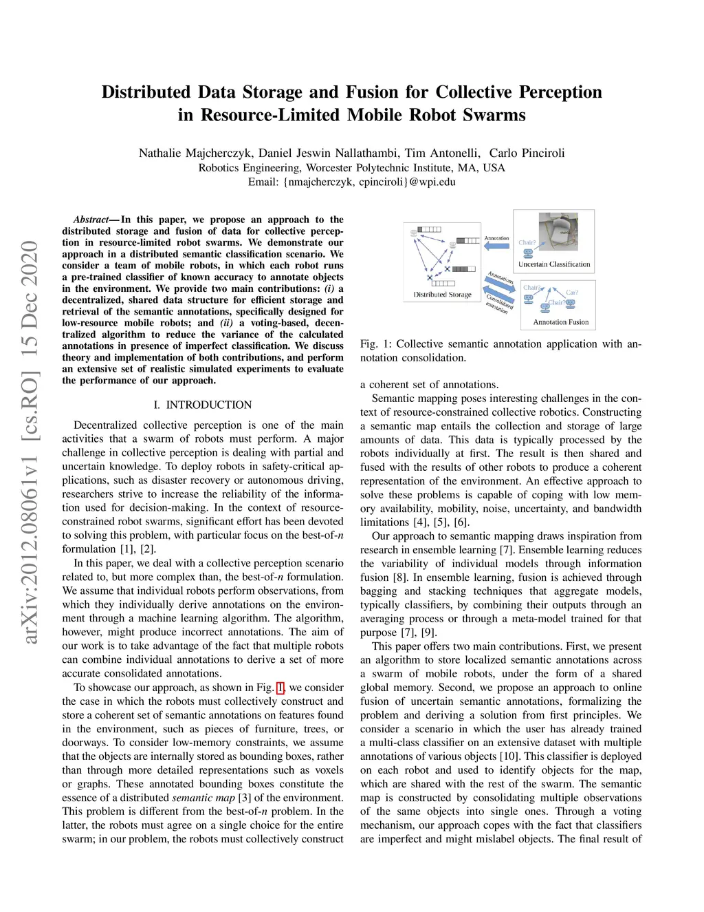 In this paper, we propose an approach to the distributed storage and fusion of data for collective perception in resource-limited robot swarms. We demonstrate our approach in a distributed semantic classification scenario. We consider a team of mobile robots, in which each robot runs a pre-trained classifier of known accuracy to annotate objects in the environment. We provide two main contributions: (i) a decentralized, shared data structure for efficient storage and retrieval of the semantic annotations, specifically designed for low-resource mobile robots; and (ii) a voting-based, decentralized algorithm to reduce the variance of the calculated annotations in presence of imperfect classification. We discuss theory and implementation of both contributions, and perform an extensive set of realistic simulated experiments to evaluate the performance of our approach.