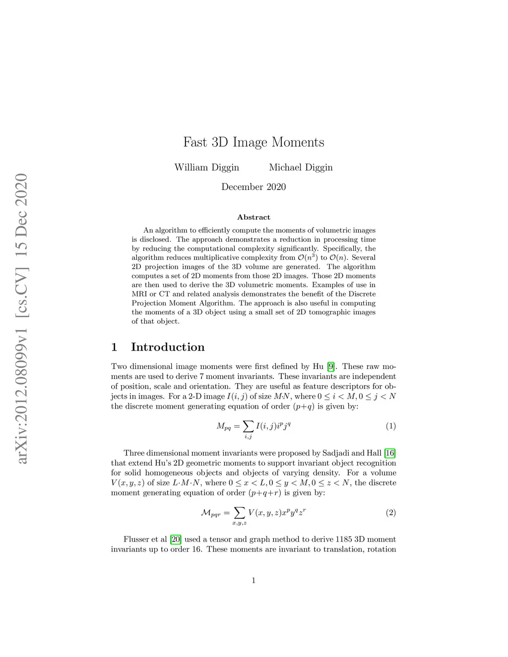 An algorithm to efficiently compute the moments of volumetric images is disclosed. The approach demonstrates a reduction in processing time by reducing the computational complexity significantly. Specifically, the algorithm reduces multiplicative complexity from O(n^3) to O(n). Several 2D projection images of the 3D volume are generated. The algorithm computes a set of 2D moments from those 2D images. Those 2D moments are then used to derive the 3D volumetric moments. Examples of use in MRI or CT and related analysis demonstrates the benefit of the Discrete Projection Moment Algorithm. The approach is also useful in computing the moments of a 3D object using a small set of 2D tomographic images of that object.