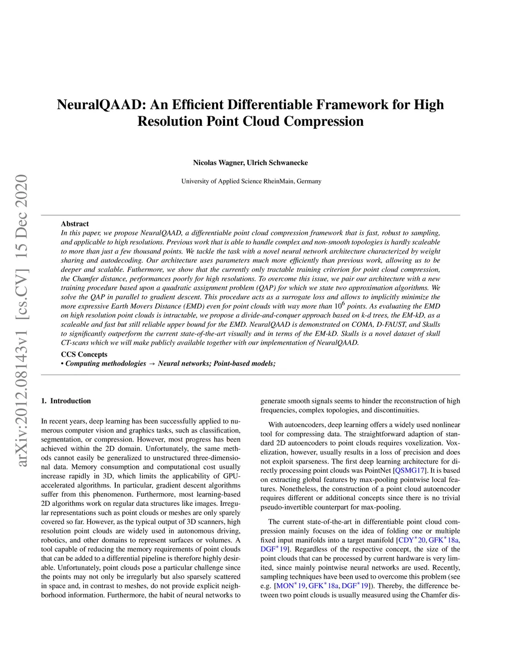 In this paper, we propose NeuralQAAD, a differentiable point cloud compression framework that is fast, robust to sampling, and applicable to high resolutions. Previous work that is able to handle complex and non-smooth topologies is hardly scaleable to more than just a few thousand points. We tackle the task with a novel neural network architecture characterized by weight sharing and autodecoding. Our architecture uses parameters much more efficiently than previous work, allowing us to be deeper and scalable. Futhermore, we show that the currently only tractable training criterion for point cloud compression, the Chamfer distance, performances poorly for high resolutions. To overcome this issue, we pair our architecture with a new training procedure based upon a quadratic assignment problem (QAP) for which we state two approximation algorithms. We solve the QAP in parallel to gradient descent. This procedure acts as a surrogate loss and allows to implicitly minimize the more expressive Earth Movers Distance (EMD) even for point clouds with way more than points. As evaluating the EMD on high resolution point clouds is intractable, we propose a divide-and-conquer approach based on k-d trees, the EM-kD, as a scaleable and fast but still reliable upper bound for the EMD. NeuralQAAD is demonstrated on COMA, D-FAUST, and Skulls to significantly outperform the current state-of-the-art visually and in terms of the EM-kD. Skulls is a novel dataset of skull CT-scans which we will make publicly available together with our implementation of NeuralQAAD.