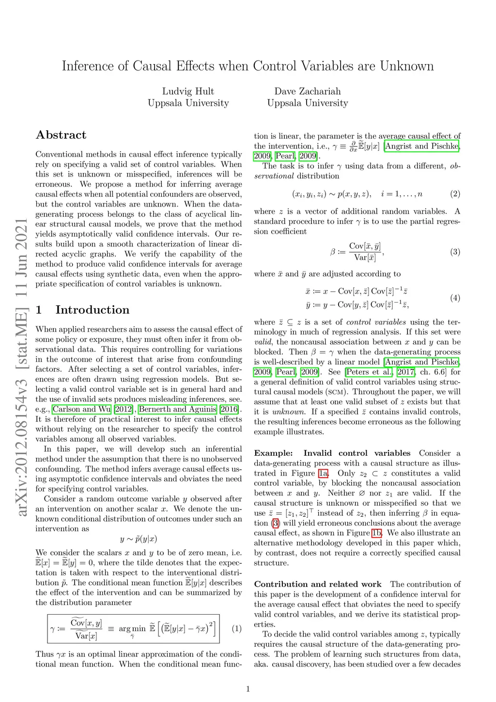 Inference of Causal Effects when Control Variables are Unknown