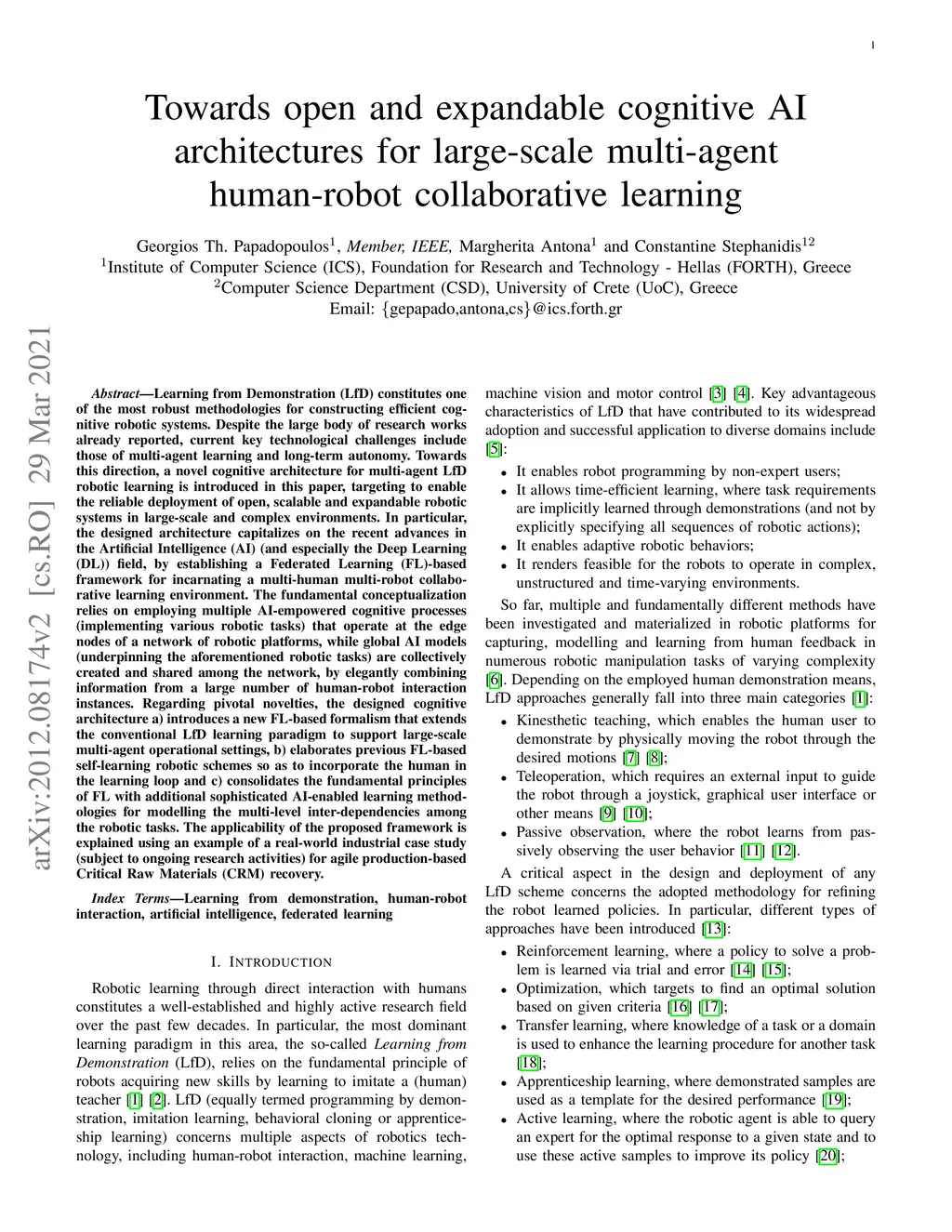 Learning from Demonstration (LfD) constitutes one of the most robust methodologies for constructing efficient cognitive robotic systems. Despite the large body of research works already reported, current key technological challenges include those of multi-agent learning and long-term autonomy. Towards this direction, a novel cognitive architecture for multi-agent LfD robotic learning is introduced, targeting to enable the reliable deployment of open, scalable and expandable robotic systems in large-scale and complex environments. In particular, the designed architecture capitalizes on the recent advances in the Artificial Intelligence (AI) field, by establishing a Federated Learning (FL)-based framework for incarnating a multi-human multi-robot collaborative learning environment. The fundamental conceptualization relies on employing multiple AI-empowered cognitive processes (implementing various robotic tasks) that operate at the edge nodes of a network of robotic platforms, while global AI models (underpinning the aforementioned robotic tasks) are collectively created and shared among the network, by elegantly combining information from a large number of human-robot interaction instances. Regarding pivotal novelties, the designed cognitive architecture a) introduces a new FL-based formalism that extends the conventional LfD learning paradigm to support large-scale multi-agent operational settings, b) elaborates previous FL-based self-learning robotic schemes so as to incorporate the human in the learning loop and c) consolidates the fundamental principles of FL with additional sophisticated AI-enabled learning methodologies for modelling the multi-level inter-dependencies among the robotic tasks. The applicability of the proposed framework is explained using an example of a real-world industrial case study for agile production-based Critical Raw Materials (CRM) recovery.