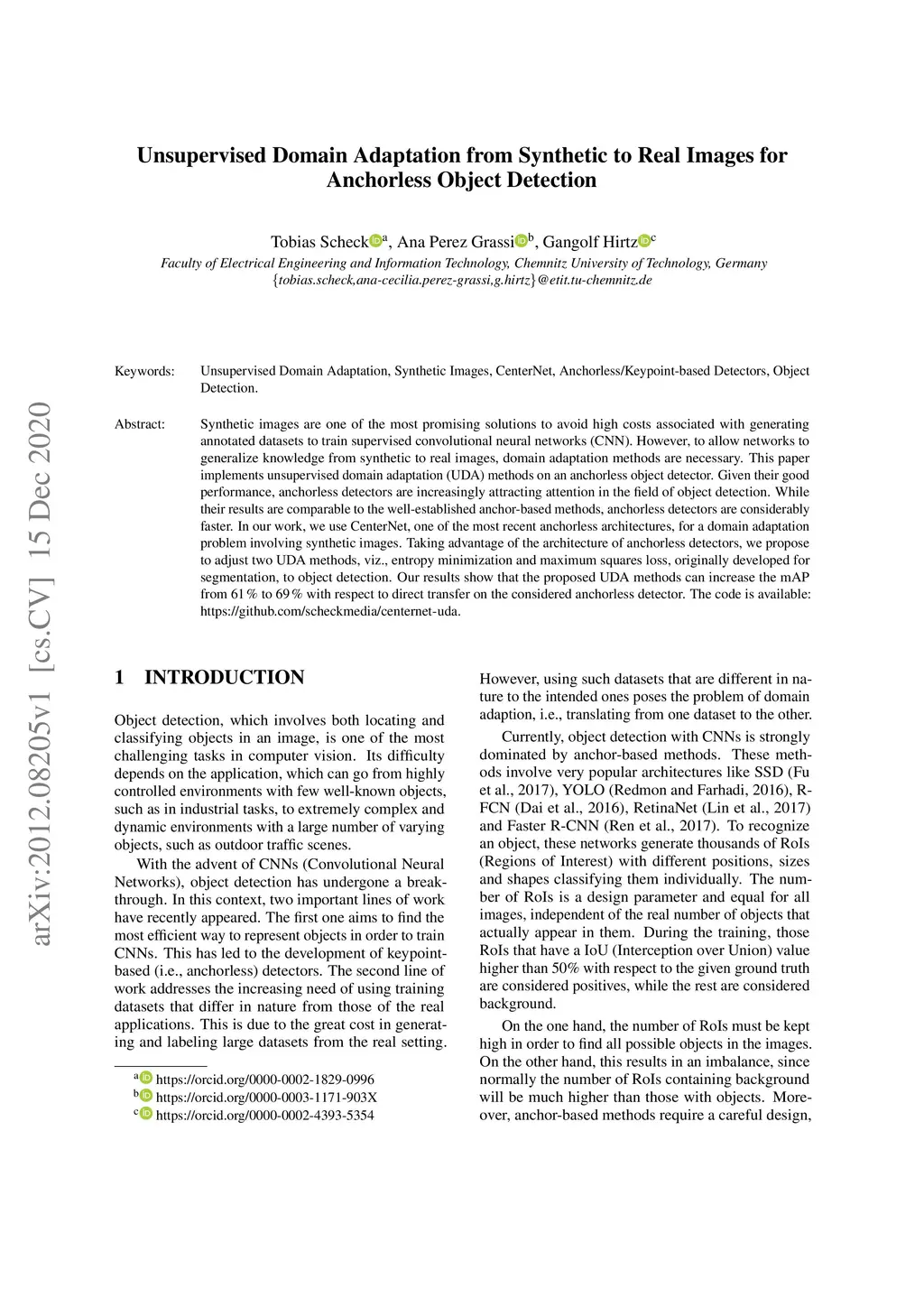 Synthetic images are one of the most promising solutions to avoid high costs associated with generating annotated datasets to train supervised convolutional neural networks (CNN). However, to allow networks to generalize knowledge from synthetic to real images, domain adaptation methods are necessary. This paper implements unsupervised domain adaptation (UDA) methods on an anchorless object detector. Given their good performance, anchorless detectors are increasingly attracting attention in the field of object detection. While their results are comparable to the well-established anchor-based methods, anchorless detectors are considerably faster. In our work, we use CenterNet, one of the most recent anchorless architectures, for a domain adaptation problem involving synthetic images. Taking advantage of the architecture of anchorless detectors, we propose to adjust two UDA methods, viz., entropy minimization and maximum squares loss, originally developed for segmentation, to object detection. Our results show that the proposed UDA methods can increase the mAPfrom61 %to69 %with respect to direct transfer on the considered anchorless detector. The code is available: https://github.com/scheckmedia/centernet-uda.