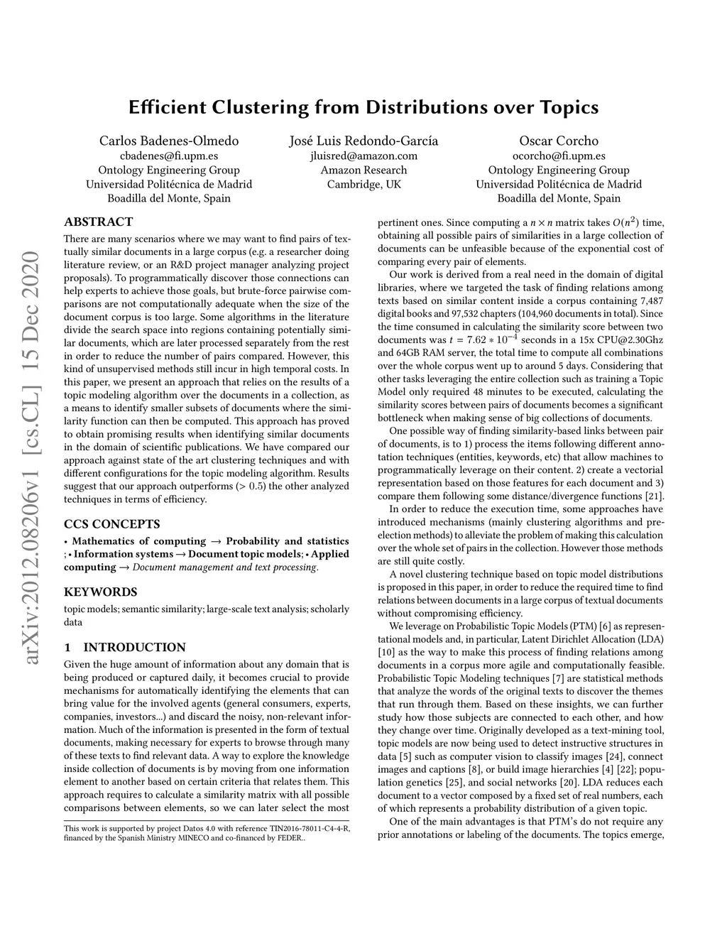 There are many scenarios where we may want to find pairs of textually similar documents in a large corpus (e.g. a researcher doing literature review, or an R&D project manager analyzing project proposals). To programmatically discover those connections can help experts to achieve those goals, but brute-force pairwise comparisons are not computationally adequate when the size of the document corpus is too large. Some algorithms in the literature divide the search space into regions containing potentially similar documents, which are later processed separately from the rest in order to reduce the number of pairs compared. However, this kind of unsupervised methods still incur in high temporal costs. In this paper, we present an approach that relies on the results of a topic modeling algorithm over the documents in a collection, as a means to identify smaller subsets of documents where the similarity function can then be computed. This approach has proved to obtain promising results when identifying similar documents in the domain of scientific publications. We have compared our approach against state of the art clustering techniques and with different configurations for the topic modeling algorithm. Results suggest that our approach outperforms (> 0.5) the other analyzed techniques in terms of efficiency.