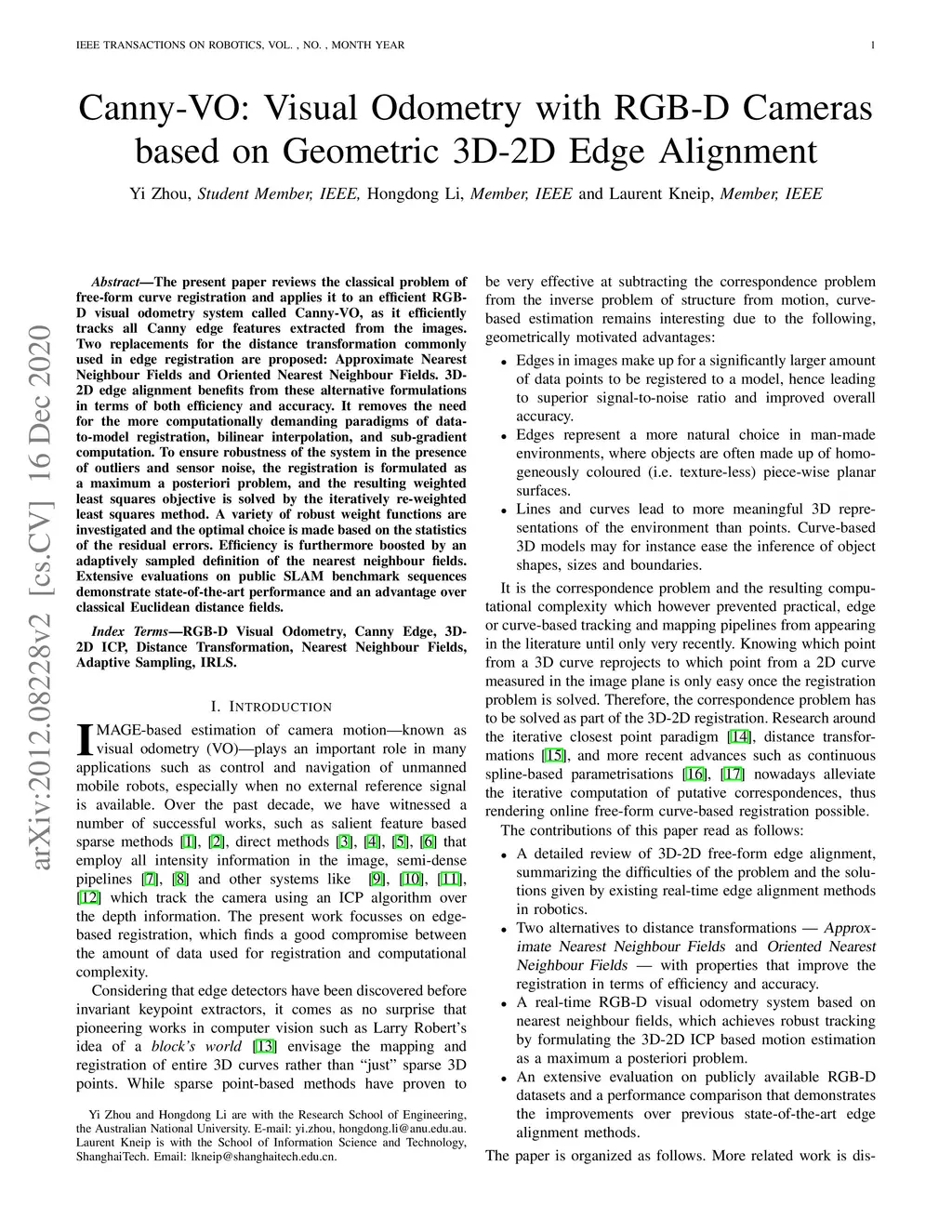 The present paper reviews the classical problem of free-form curve registration and applies it to an efficient RGBD visual odometry system called Canny-VO, as it efficiently tracks all Canny edge features extracted from the images. Two replacements for the distance transformation commonly used in edge registration are proposed: Approximate Nearest Neighbour Fields and Oriented Nearest Neighbour Fields. 3D2D edge alignment benefits from these alternative formulations in terms of both efficiency and accuracy. It removes the need for the more computationally demanding paradigms of datato-model registration, bilinear interpolation, and sub-gradient computation. To ensure robustness of the system in the presence of outliers and sensor noise, the registration is formulated as a maximum a posteriori problem, and the resulting weighted least squares objective is solved by the iteratively re-weighted least squares method. A variety of robust weight functions are investigated and the optimal choice is made based on the statistics of the residual errors. Efficiency is furthermore boosted by an adaptively sampled definition of the nearest neighbour fields. Extensive evaluations on public SLAM benchmark sequences demonstrate state-of-the-art performance and an advantage over classical Euclidean distance fields.