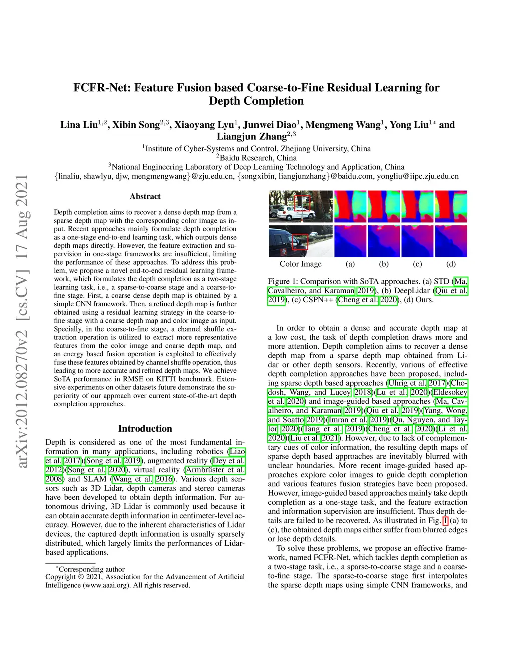 Depth completion aims to recover a dense depth map from a sparse depth map with the corresponding color image as input. Recent approaches mainly formulate depth completion as a one-stage end-to-end learning task, which outputs dense depth maps directly. However, the feature extraction and supervision in one-stage frameworks are insufficient, limiting the performance of these approaches. To address this problem, we propose a novel end-to-end residual learning framework, which formulates the depth completion as a two-stage learning task, i.e., a sparse-to-coarse stage and a coarse-to-fine stage. First, a coarse dense depth map is obtained by a simple CNN framework. Then, a refined depth map is further obtained using a residual learning strategy in the coarse-to-fine stage with a coarse depth map and color image as input. Specially, in the coarse-to-fine stage, a channel shuffle extraction operation is utilized to extract more representative features from the color image and coarse depth map, and an energy based fusion operation is exploited to effectively fuse these features obtained by channel shuffle operation, thus leading to more accurate and refined depth maps. We achieve SoTA performance in RMSE on KITTI benchmark. Extensive experiments on other datasets future demonstrate the superiority of our approach over current state-of-the-art depth completion approaches.