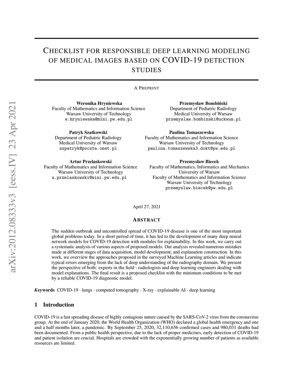 The sudden outbreak and uncontrolled spread of COVID-19 disease is one of the most important global problems today. In a short period of time, it has led to the development of many deep neural network models for COVID-19 detection with modules for explainability. In this work, we carry out a systematic analysis of various aspects of proposed models. Our analysis revealed numerous mistakes made at different stages of data acquisition, model development, and explanation construction. In this work, we overview the approaches proposed in the surveyed ML articles and indicate typical errors emerging from the lack of deep understanding of the radiography domain. We present the perspective of both: experts in the field - radiologists, and deep learning engineers dealing with model explanations. The final result is a proposed a checklist with the minimum conditions to be met by a reliable COVID-19 diagnostic model.