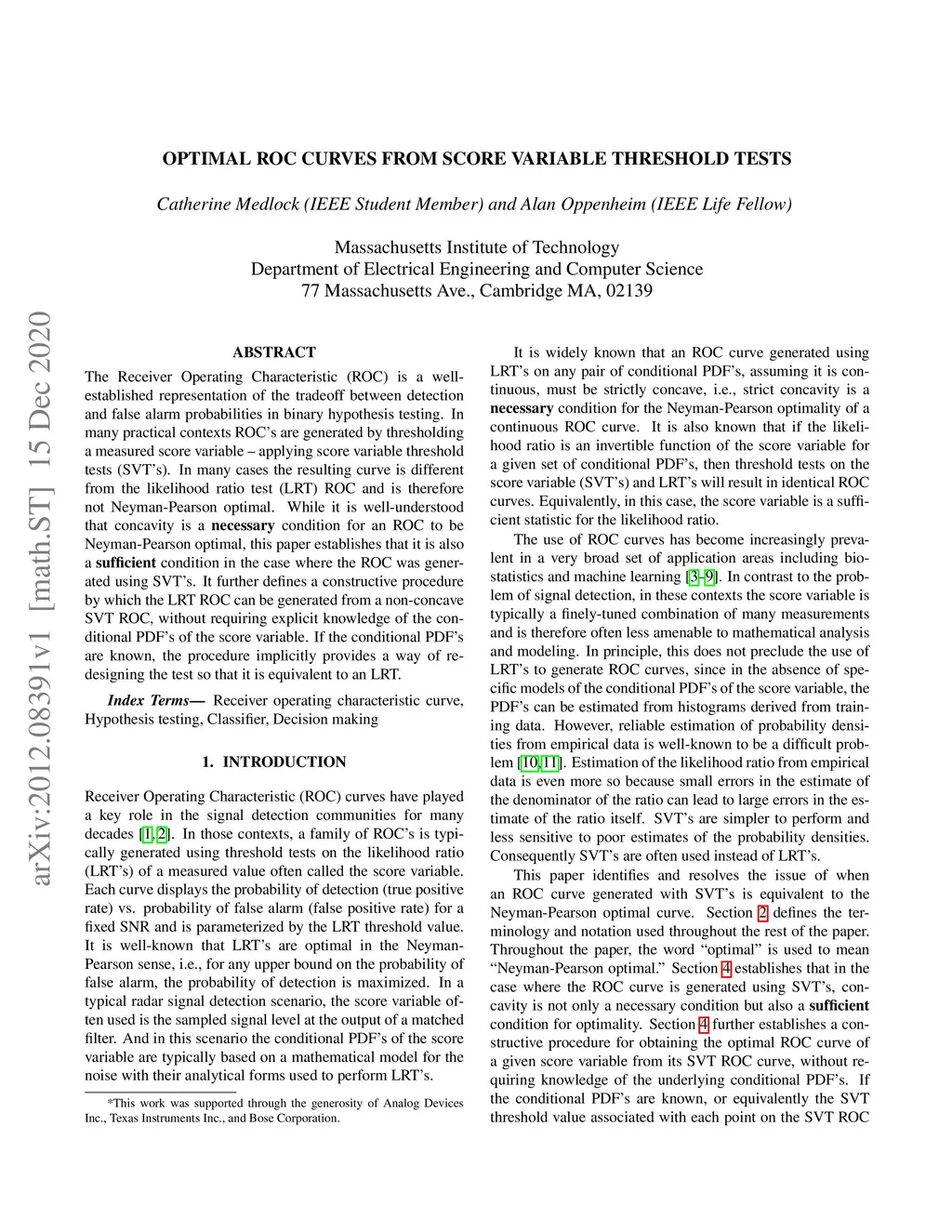 The Receiver Operating Characteristic (ROC) is a well-established representation of the tradeoff between detection and false alarm probabilities in binary hypothesis testing. In many practical contexts ROC's are generated by thresholding a measured score variable -- applying score variable threshold tests (SVT's). In many cases the resulting curve is different from the likelihood ratio test (LRT) ROC and is therefore not Neyman-Pearson optimal. While it is well-understood that concavity is a necessary condition for an ROC to be Neyman-Pearson optimal, this paper establishes that it is also a sufficient condition in the case where the ROC was generated using SVT's. It further defines a constructive procedure by which the LRT ROC can be generated from a non-concave SVT ROC, without requiring explicit knowledge of the conditional PDF's of the score variable. If the conditional PDF's are known, the procedure implicitly provides a way of redesigning the test so that it is equivalent to an LRT.