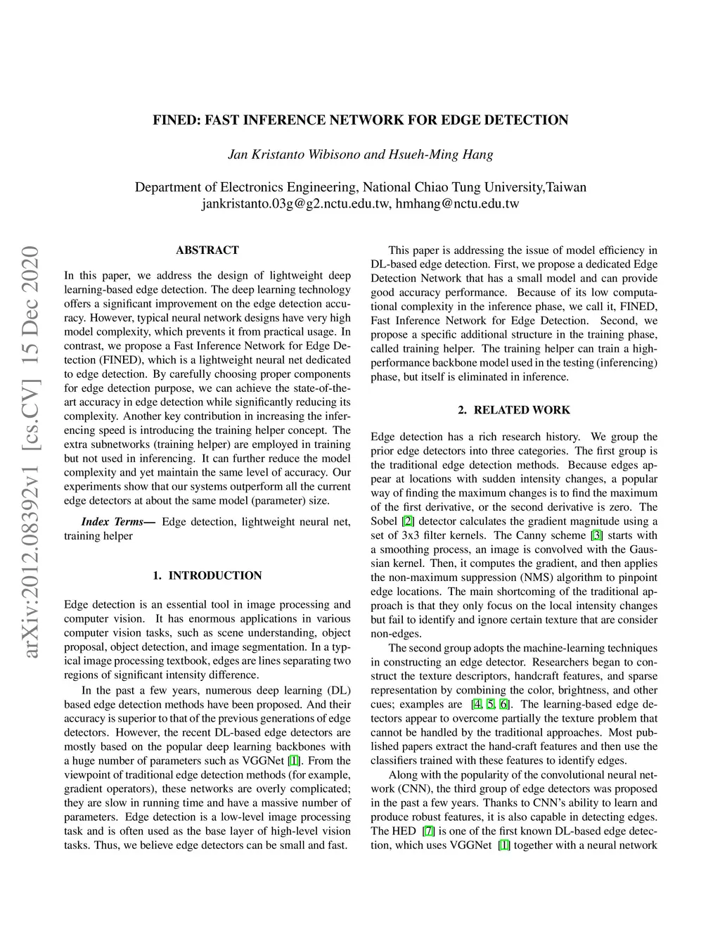 In this paper, we address the design of lightweight deep learning-based edge detection. The deep learning technology offers a significant improvement on the edge detection accuracy. However, typical neural network designs have very high model complexity, which prevents it from practical usage. In contrast, we propose a Fast Inference Network for Edge Detection (FINED), which is a lightweight neural net dedicated to edge detection. By carefully choosing proper components for edge detection purpose, we can achieve the state-of-the-art accuracy in edge detection while significantly reducing its complexity. Another key contribution in increasing the inferencing speed is introducing the training helper concept. The extra subnetworks (training helper) are employed in training but not used in inferencing. It can further reduce the model complexity and yet maintain the same level of accuracy. Our experiments show that our systems outperform all the current edge detectors at about the same model (parameter) size.