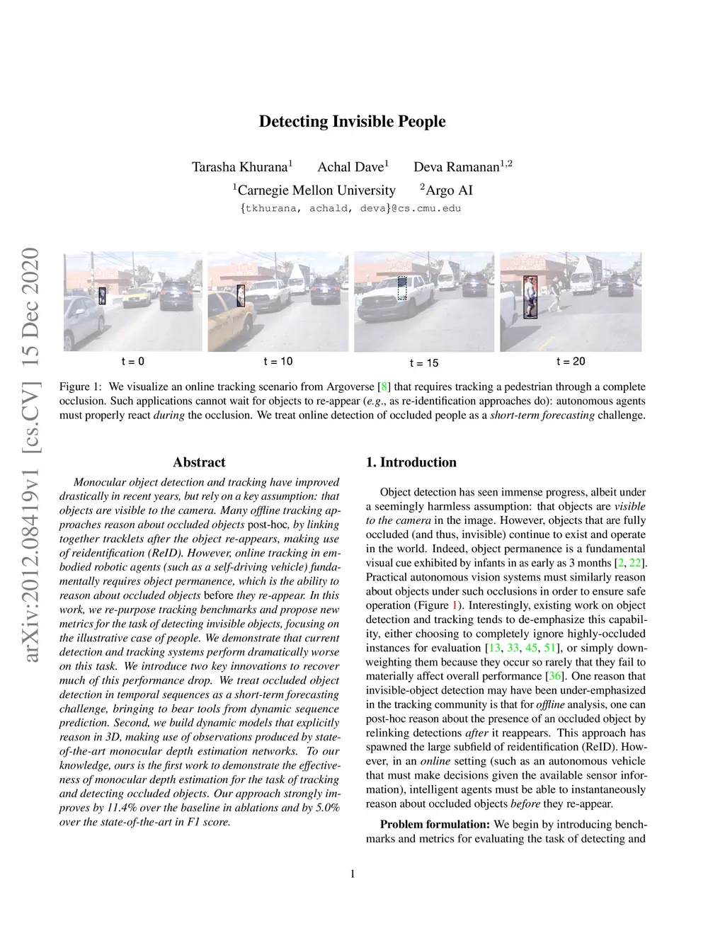 Monocular object detection and tracking have improved drastically in recent years, but rely on a key assumption: that objects are visible to the camera. Many offline tracking approaches reason about occluded objects post-hoc, by linking together tracklets after the object re-appears, making use of reidentification (ReID). However, online tracking in embodied robotic agents (such as a self-driving vehicle) fundamentally requires object permanence, which is the ability to reason about occluded objects before they re-appear. In this work, we re-purpose tracking benchmarks and propose new metrics for the task of detecting invisible objects, focusing on the illustrative case of people. We demonstrate that current detection and tracking systems perform dramatically worse on this task. We introduce two key innovations to recover much of this performance drop. We treat occluded object detection in temporal sequences as a short-term forecasting challenge, bringing to bear tools from dynamic sequence prediction. Second, we build dynamic models that explicitly reason in 3D, making use of observations produced by state-of-the-art monocular depth estimation networks. To our knowledge, ours is the first work to demonstrate the effectiveness of monocular depth estimation for the task of tracking and detecting occluded objects. Our approach strongly improves by 11.4% over the baseline in ablations and by 5.0% over the state-of-the-art in F1 score.