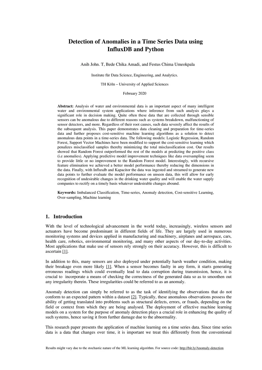 Analysis of water and environmental data is an important aspect of many intelligent water and environmental system applications where inference from such analysis plays a significant role in decision making. Quite often these data that are collected through sensible sensors can be anomalous due to different reasons such as systems breakdown, malfunctioning of sensor detectors, and more. Regardless of their root causes, such data severely affect the results of the subsequent analysis. This paper demonstrates data cleaning and preparation for time-series data and further proposes cost-sensitive machine learning algorithms as a solution to detect anomalous data points in time-series data. The following models: Logistic Regression, Random Forest, Support Vector Machines have been modified to support the cost-sensitive learning which penalizes misclassified samples thereby minimizing the total misclassification cost. Our results showed that Random Forest outperformed the rest of the models at predicting the positive class (i.e anomalies). Applying predictive model improvement techniques like data oversampling seems to provide little or no improvement to the Random Forest model. Interestingly, with recursive feature elimination, we achieved a better model performance thereby reducing the dimensions in the data. Finally, with Influxdb and Kapacitor the data was ingested and streamed to generate new data points to further evaluate the model performance on unseen data, this will allow for early recognition of undesirable changes in the drinking water quality and will enable the water supply companies to rectify on a timely basis whatever undesirable changes abound.