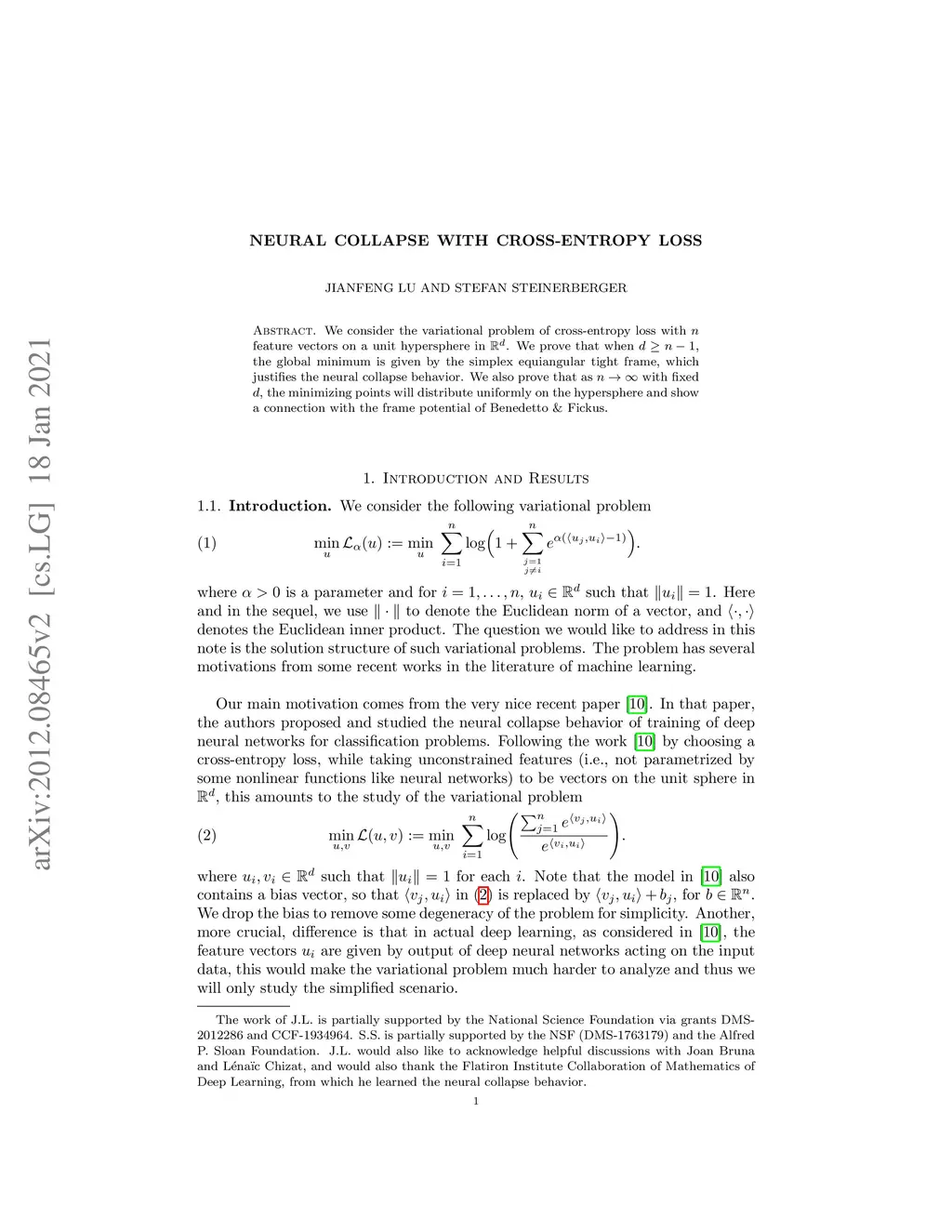 We consider the variational problem of cross-entropy loss with feature vectors on a unit hypersphere in . We prove that when , the global minimum is given by the simplex equiangular tight frame, which justifies the neural collapse behavior. We also prove that as with fixed , the minimizing points will distribute uniformly on the hypersphere and show a connection with the frame potential of Benedetto & Fickus.