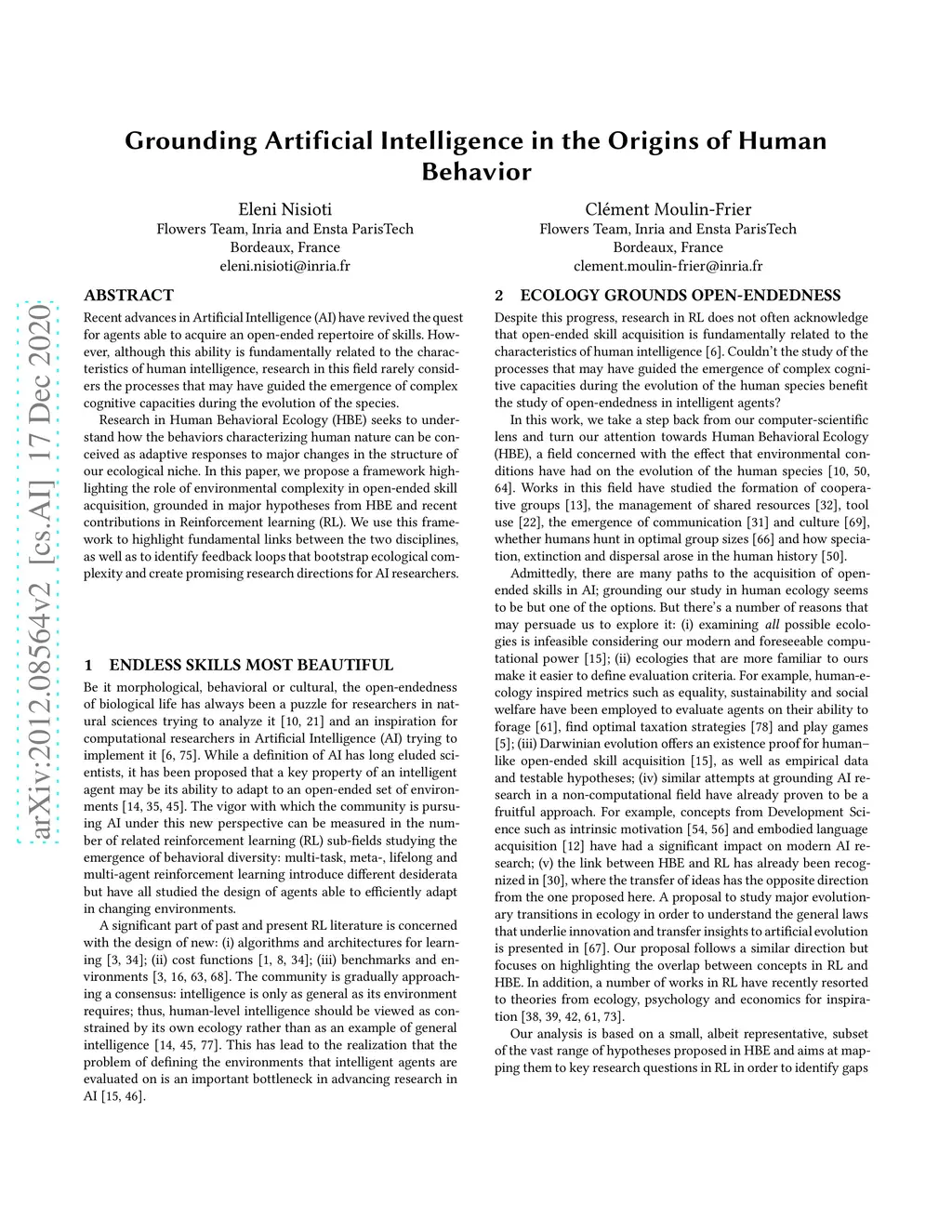 Recent advances in Artificial Intelligence (AI) have revived the quest for agents able to acquire an open-ended repertoire of skills. However, although this ability is fundamentally related to the characteristics of human intelligence, research in this field rarely considers the processes that may have guided the emergence of complex cognitive capacities during the evolution of the species. Research in Human Behavioral Ecology (HBE) seeks to understand how the behaviors characterizing human nature can be conceived as adaptive responses to major changes in the structure of our ecological niche. In this paper, we propose a framework highlighting the role of environmental complexity in open-ended skill acquisition, grounded in major hypotheses from HBE and recent contributions in Reinforcement learning (RL). We use this framework to highlight fundamental links between the two disciplines, as well as to identify feedback loops that bootstrap ecological complexity and create promising research directions for AI researchers.