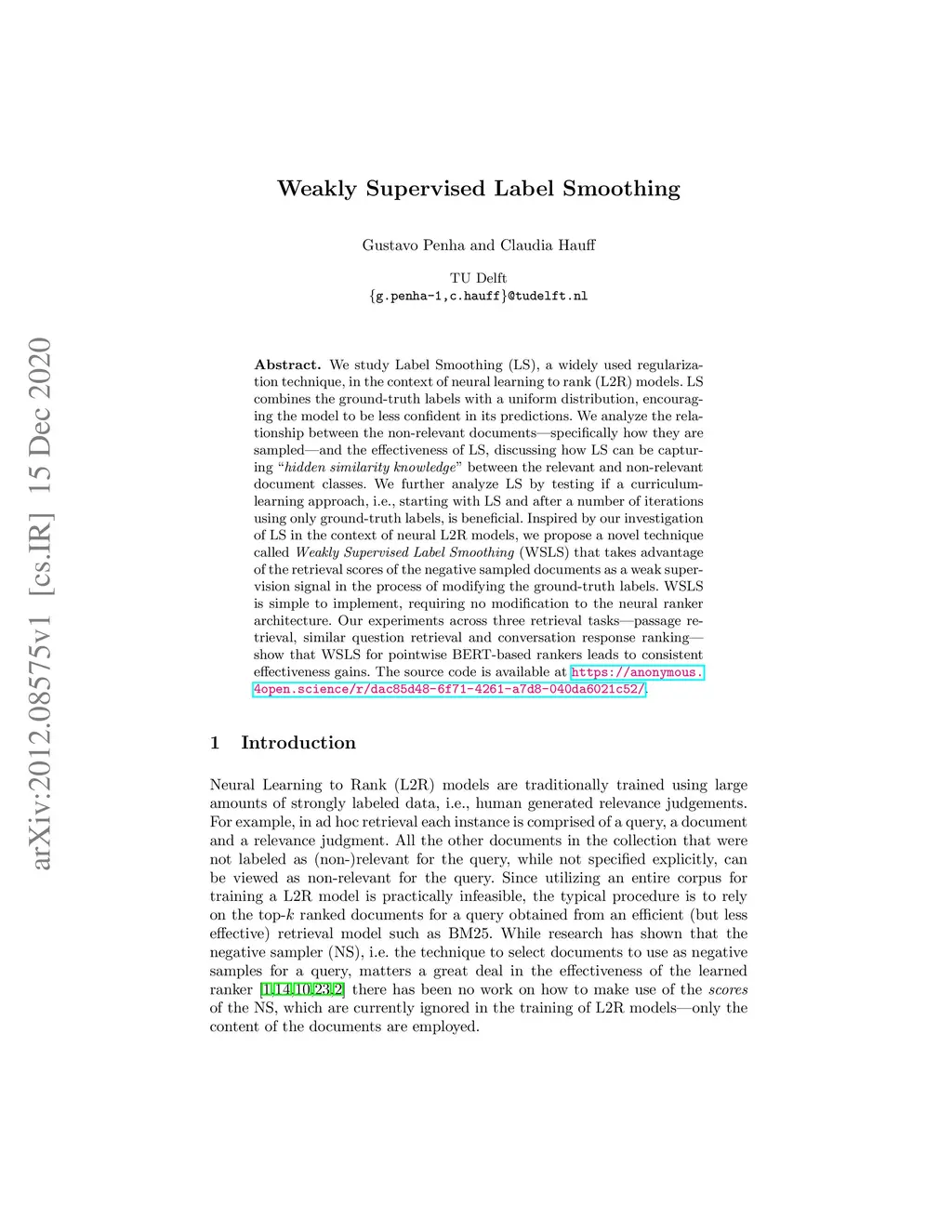 We study Label Smoothing (LS), a widely used regularization technique, in the context of neural learning to rank (L2R) models. LS combines the ground-truth labels with a uniform distribution, encouraging the model to be less confident in its predictions. We analyze the relationship between the non-relevant documents-specifically how they are sampled-and the effectiveness of LS, discussing how LS can be capturing "hidden similarity knowledge" between the relevantand non-relevant document classes. We further analyze LS by testing if a curriculum-learning approach, i.e., starting with LS and after anumber of iterations using only ground-truth labels, is beneficial. Inspired by our investigation of LS in the context of neural L2R models, we propose a novel technique called Weakly Supervised Label Smoothing (WSLS) that takes advantage of the retrieval scores of the negative sampled documents as a weak supervision signal in the process of modifying the ground-truth labels. WSLS is simple to implement, requiring no modification to the neural ranker architecture. Our experiments across three retrieval tasks-passage retrieval, similar question retrieval and conversation response ranking-show that WSLS for pointwise BERT-based rankers leads to consistent effectiveness gains. The source code is available at https://anonymous.4open.science/r/dac85d48-6f71-4261-a7d8-040da6021c52/.