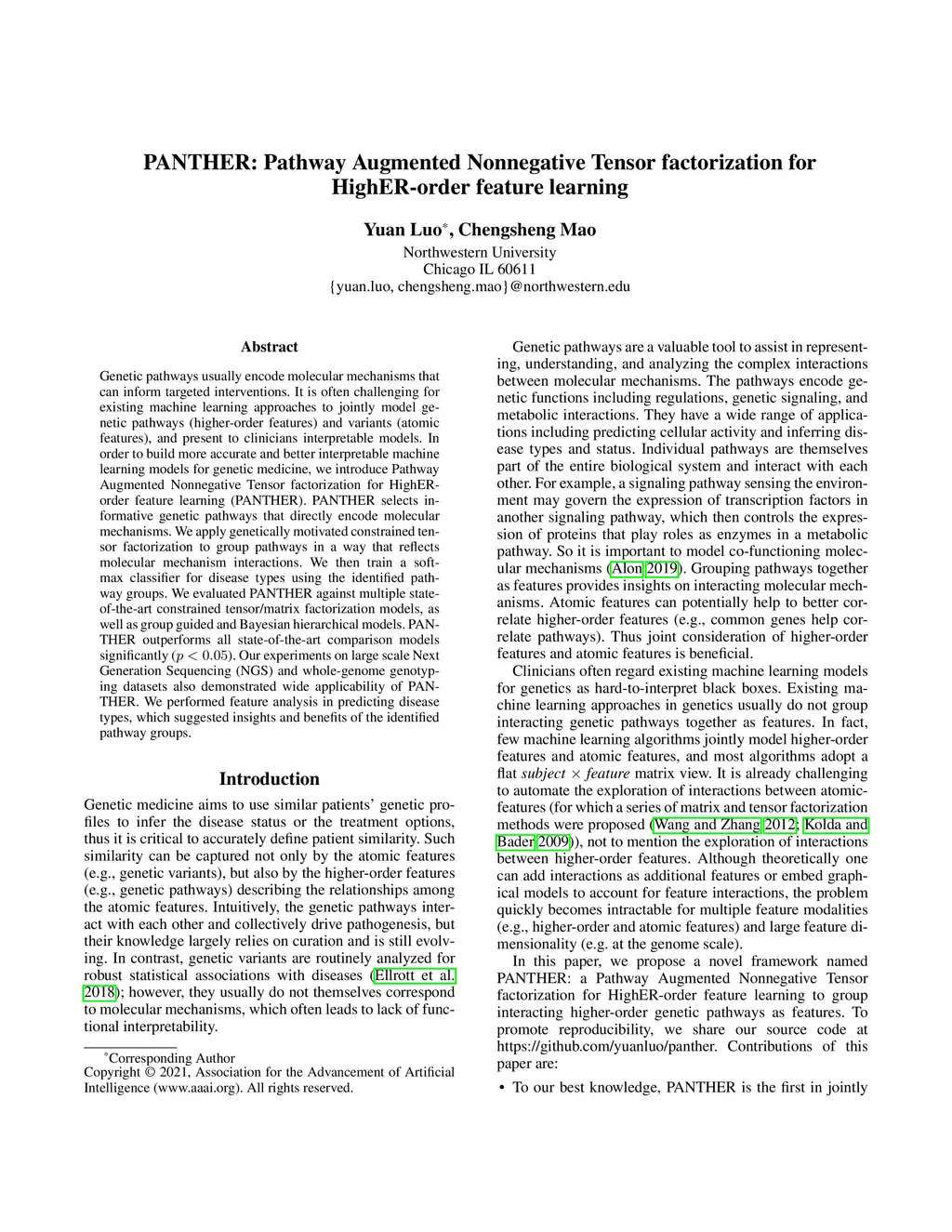Genetic pathways usually encode molecular mechanisms that can inform targeted interventions. It is often challenging for existing machine learning approaches to jointly model genetic pathways (higher-order features) and variants (atomic features), and present to clinicians interpretable models. In order to build more accurate and better interpretable machine learning models for genetic medicine, we introduce Pathway Augmented Nonnegative Tensor factorization for HighER-order feature learning (PANTHER). PANTHER selects informative genetic pathways that directly encode molecular mechanisms. We apply genetically motivated constrained tensor factorization to group pathways in a way that reflects molecular mechanism interactions. We then train a softmax classifier for disease types using the identified pathway groups. We evaluated PANTHER against multiple state-of-the-art constrained tensor/matrix factorization models, as well as group guided and Bayesian hierarchical models. PANTHER outperforms all state-of-the-art comparison models significantly (p<0.05). Our experiments on large scale Next Generation Sequencing (NGS) and whole-genome genotyping datasets also demonstrated wide applicability of PANTHER. We performed feature analysis in predicting disease types, which suggested insights and benefits of the identified pathway groups.