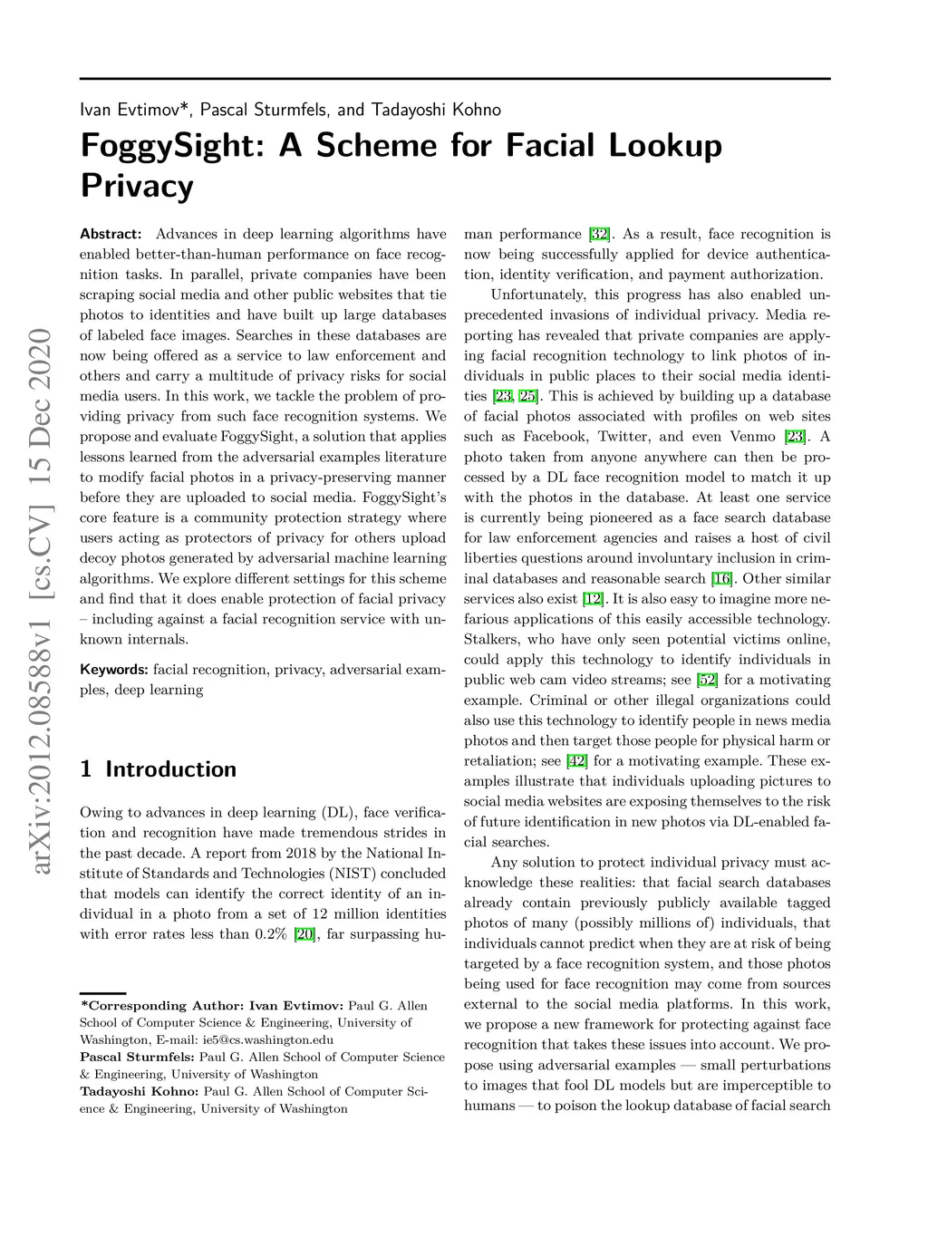 Advances in deep learning algorithms have enabled better-than-human performance on face recognition tasks. In parallel, private companies have been scraping social media and other public websites that tie photos to identities and have built up large databases of labeled face images. Searches in these databases are now being offered as a service to law enforcement and others and carry a multitude of privacy risks for social media users. In this work, we tackle the problem of providing privacy from such face recognition systems. We propose and evaluate FoggySight, a solution that applies lessons learned from the adversarial examples literature to modify facial photos in a privacy-preserving manner before they are uploaded to social media. FoggySight's core feature is a community protection strategy where users acting as protectors of privacy for others upload decoy photos generated by adversarial machine learning algorithms. We explore different settings for this scheme and find that it does enable protection of facial privacy -- including against a facial recognition service with unknown internals.