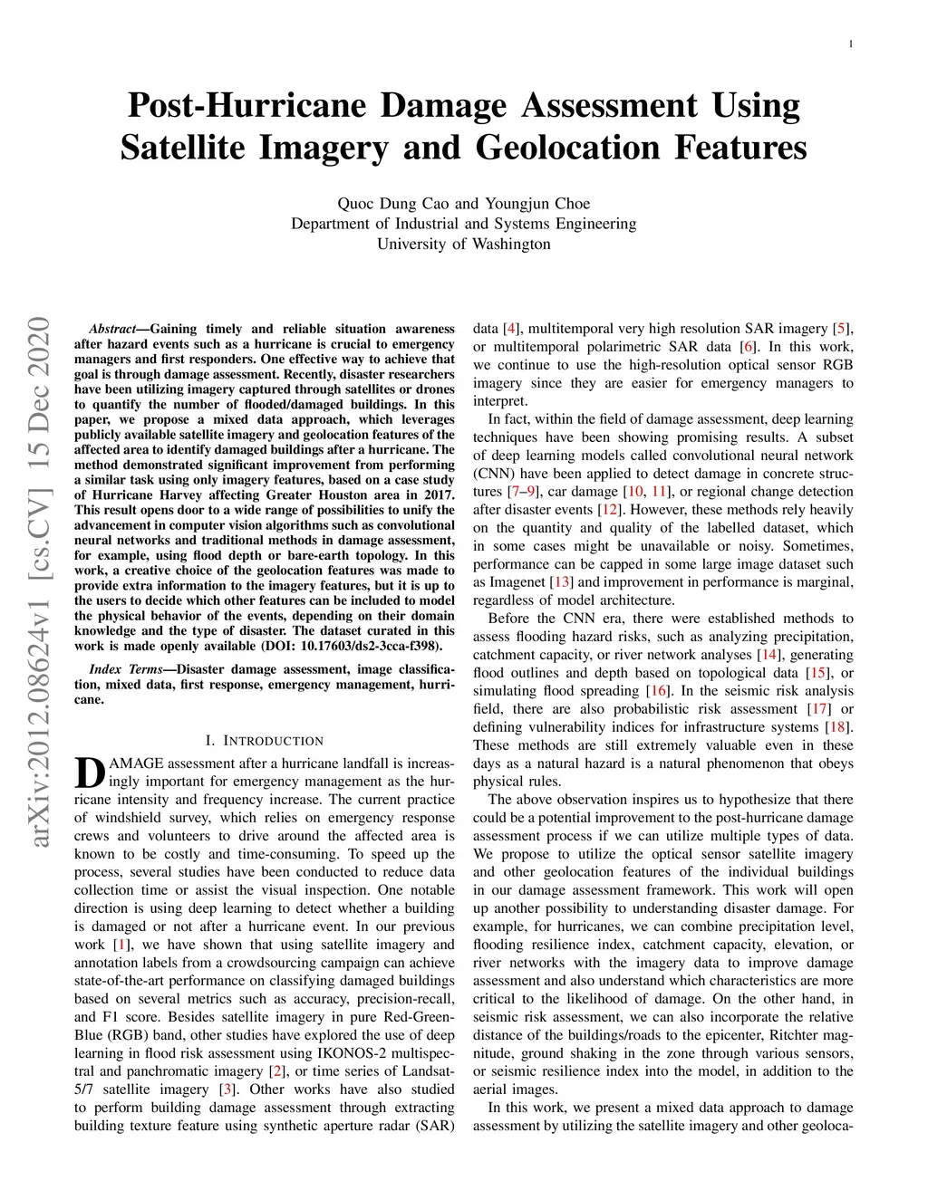 Gaining timely and reliable situation awareness after hazard events such as a hurricane is crucial to emergency managers and first responders. One effective way to achieve that goal is through damage assessment. Recently, disaster researchers have been utilizing imagery captured through satellites or drones to quantify the number of flooded/damaged buildings. In this paper, we propose a mixed data approach, which leverages publicly available satellite imagery and geolocation features of the affected area to identify damaged buildings after a hurricane. The method demonstrated significant improvement from performing a similar task using only imagery features, based on a case study of Hurricane Harvey affecting Greater Houston area in 2017. This result opens door to a wide range of possibilities to unify the advancement in computer vision algorithms such as convolutional neural networks and traditional methods in damage assessment, for example, using flood depth or bare-earth topology. In this work, a creative choice of the geolocation features was made to provide extra information to the imagery features, but it is up to the users to decide which other features can be included to model the physical behavior of the events, depending on their domain knowledge and the type of disaster. The dataset curated in this work is made openly available (DOI: 10.17603/ds2-3cca-f398).