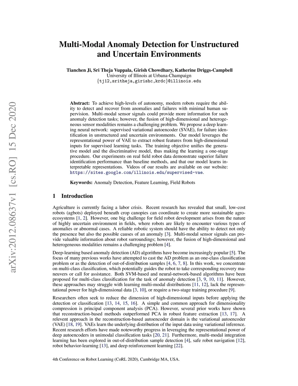 To achieve high-levels of autonomy, modern robots require the ability to detect and recover from anomalies and failures with minimal human supervision. Multi-modal sensor signals could provide more information for such anomaly detection tasks; however, the fusion of high-dimensional and heterogeneous sensor modalities remains a challenging problem. We propose a deep learning neural network: supervised variational autoencoder (SVAE), for failure identification in unstructured and uncertain environments. Our model leverages the representational power of VAE to extract robust features from high-dimensional inputs for supervised learning tasks. The training objective unifies the generative model and the discriminative model, thus making the learning a one-stage procedure. Our experiments on real field robot data demonstrate superior failure identification performance than baseline methods, and that our model learns interpretable representations. Videos of our results are available on our website: https://sites.google.com/illinois.edu/supervised-vae .