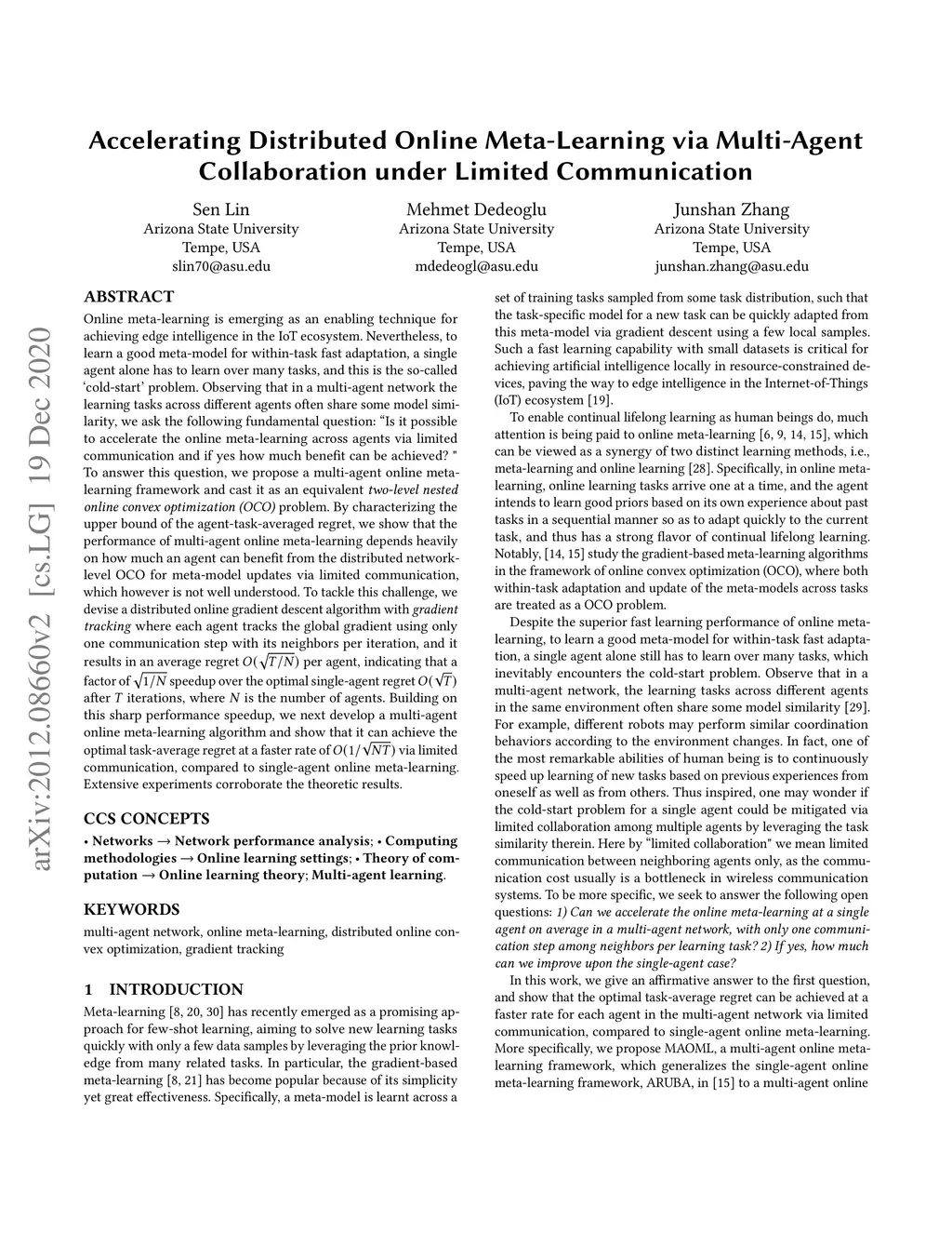 Online meta-learning is emerging as an enabling technique for achieving edge intelligence in the IoT ecosystem. Nevertheless, to learn a good meta-model for within-task fast adaptation, a single agent alone has to learn over many tasks, and this is the so-called 'cold-start' problem. Observing that in a multi-agent network the learning tasks across different agents often share some model similarity, we ask the following fundamental question: "Is it possible to accelerate the online meta-learning across agents via limited communication and if yes how much benefit can be achieved? " To answer this question, we propose a multi-agent online meta-learning framework and cast it as an equivalent two-level nested online convex optimization (OCO) problem. By characterizing the upper bound of the agent-task-averaged regret, we show that the performance of multi-agent online meta-learning depends heavily on how much an agent can benefit from the distributed network-level OCO for meta-model updates via limited communication, which however is not well understood. To tackle this challenge, we devise a distributed online gradient descent algorithm with gradient tracking where each agent tracks the global gradient using only one communication step with its neighbors per iteration, and it results in an average regret per agent, indicating that a factor of speedup over the optimal single-agent regret after iterations, where is the number of agents. Building on this sharp performance speedup, we next develop a multi-agent online meta-learning algorithm and show that it can achieve the optimal task-average regret at a faster rate of via limited communication, compared to single-agent online meta-learning. Extensive experiments corroborate the theoretic results.