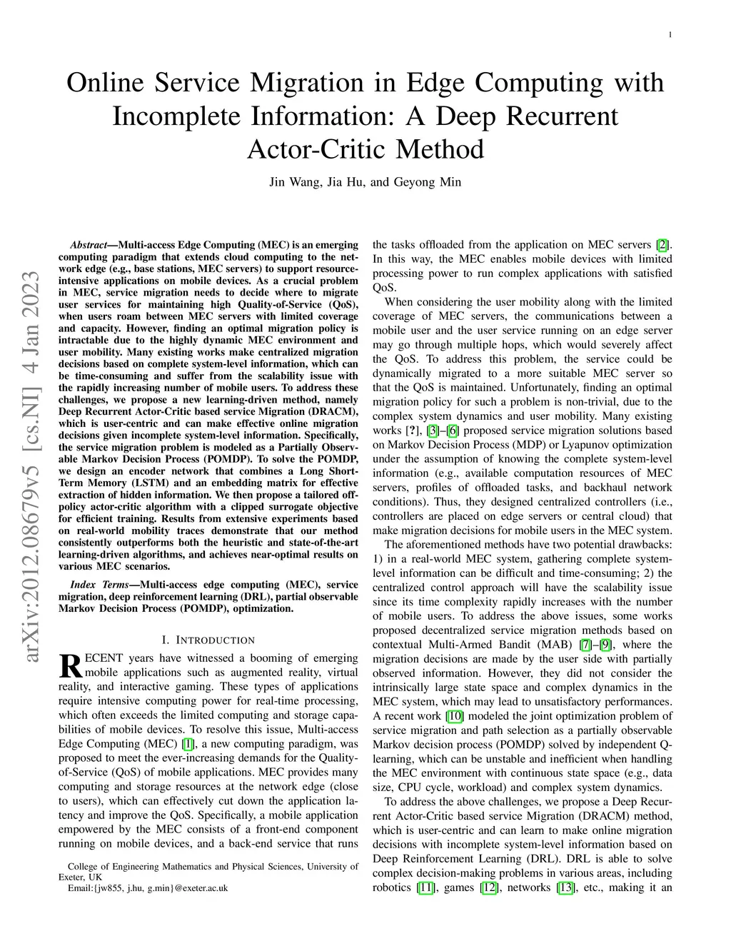 Multi-access Edge Computing (MEC) is an emerging computing paradigm that extends cloud computing to the network edge to support resource-intensive applications on mobile devices. As a crucial problem in MEC, service migration needs to decide how to migrate user services for maintaining the Quality-of-Service when users roam between MEC servers with limited coverage and capacity. However, finding an optimal migration policy is intractable due to the dynamic MEC environment and user mobility. Many existing studies make centralized migration decisions based on complete system-level information, which is time-consuming and also lacks desirable scalability. To address these challenges, we propose a novel learning-driven method, which is user-centric and can make effective online migration decisions by utilizing incomplete system-level information. Specifically, the service migration problem is modeled as a Partially Observable Markov Decision Process (POMDP). To solve the POMDP, we design a new encoder network that combines a Long Short-Term Memory (LSTM) and an embedding matrix for effective extraction of hidden information, and further propose a tailored off-policy actor-critic algorithm for efficient training. The extensive experimental results based on real-world mobility traces demonstrate that this new method consistently outperforms both the heuristic and state-of-the-art learning-driven algorithms and can achieve near-optimal results on various MEC scenarios.