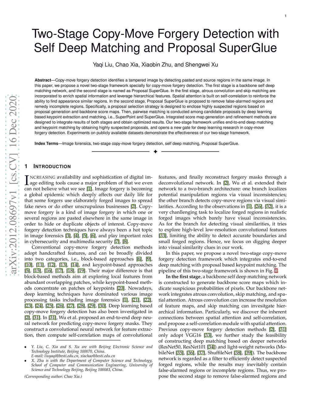 Copy-move forgery detection identifies a tampered image by detecting pasted and source regions in the same image. In this paper, we propose a novel two-stage framework specially for copy-move forgery detection. The first stage is a backbone self deep matching network, and the second stage is named as Proposal SuperGlue. In the first stage, atrous convolution and skip matching are incorporated to enrich spatial information and leverage hierarchical features. Spatial attention is built on self-correlation to reinforce the ability to find appearance similar regions. In the second stage, Proposal SuperGlue is proposed to remove false-alarmed regions and remedy incomplete regions. Specifically, a proposal selection strategy is designed to enclose highly suspected regions based on proposal generation and backbone score maps. Then, pairwise matching is conducted among candidate proposals by deep learning based keypoint extraction and matching, i.e., SuperPoint and SuperGlue. Integrated score map generation and refinement methods are designed to integrate results of both stages and obtain optimized results. Our two-stage framework unifies end-to-end deep matching and keypoint matching by obtaining highly suspected proposals, and opens a new gate for deep learning research in copy-move forgery detection. Experiments on publicly available datasets demonstrate the effectiveness of our two-stage framework.