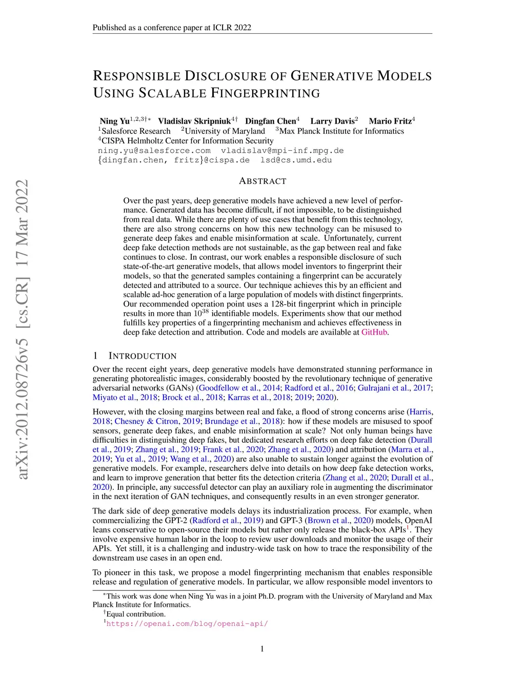 Over the past years, deep generative models have achieved a new level of performance. Generated data has become difficult, if not impossible, to be distinguished from real data. While there are plenty of use cases that benefit from this technology, there are also strong concerns on how this new technology can be misused to generate deep fakes and enable misinformation at scale. Unfortunately, current deep fake detection methods are not sustainable, as the gap between real and fake continues to close. In contrast, our work enables a responsible disclosure of such state-of-the-art generative models, that allows model inventors to fingerprint their models, so that the generated samples containing a fingerprint can be accurately detected and attributed to a source. Our technique achieves this by an efficient and scalable ad-hoc generation of a large population of models with distinct fingerprints. Our recommended operation point uses a 128-bit fingerprint which in principle results in more than identifiable models. Experiments show that our method fulfills key properties of a fingerprinting mechanism and achieves effectiveness in deep fake detection and attribution. Code and models are available at https://github.com/ningyu1991/ScalableGANFingerprints .