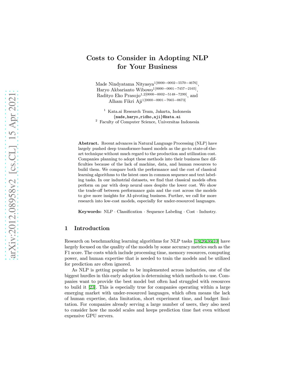 Recent advances in Natural Language Processing (NLP) have largely pushed deep transformer-based models as the go-to state-of-the-art technique without much regard to the production and utilization cost. Companies planning to adopt these methods into their business face difficulties because of the lack of machine and human resources to build them. In this work, we compare both the performance and the cost of classical learning algorithms to the latest ones in common sequence and text labeling tasks. We find that classical models often perform on par with deep neural ones despite the lower cost. We argue that under many circumstances the smaller and lighter models fit better for AI-pivoting businesses and that we call for more research into low-cost models, especially for under-resourced languages.
