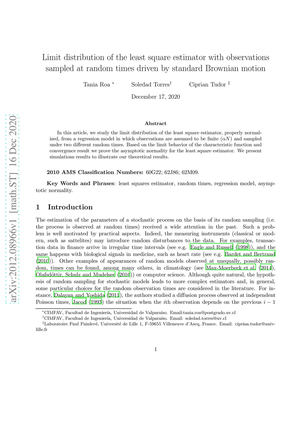 In this article, we study the limit distribution of the least square estimator, properly normalized, from a regression model in which observations are assumed to be finite () and sampled under two different random times. Based on the limit behavior of the characteristic function and convergence result we prove the asymptotic normality for the least square estimator. We present simulation results to illustrate our theoretical results.