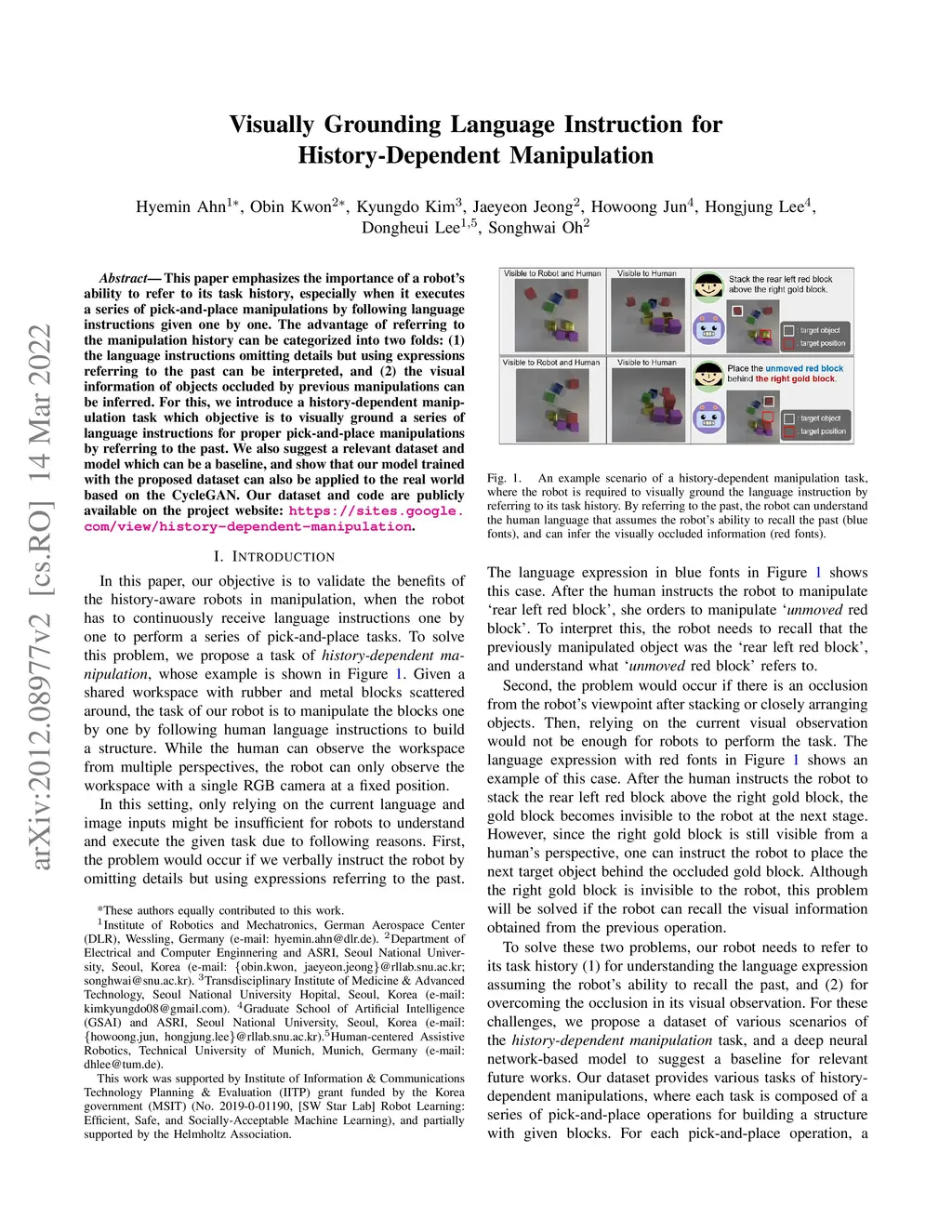 This paper emphasizes the importance of a robot's ability to refer to its task history, especially when it executes a series of pick-and-place manipulations by following language instructions given one by one. The advantage of referring to the manipulation history can be categorized into two folds: (1) the language instructions omitting details but using expressions referring to the past can be interpreted, and (2) the visual information of objects occluded by previous manipulations can be inferred. For this, we introduce a history-dependent manipulation task which objective is to visually ground a series of language instructions for proper pick-and-place manipulations by referring to the past. We also suggest a relevant dataset and model which can be a baseline, and show that our model trained with the proposed dataset can also be applied to the real world based on the CycleGAN. Our dataset and code are publicly available on the project website: https://sites.google.com/view/history-dependent-manipulation.