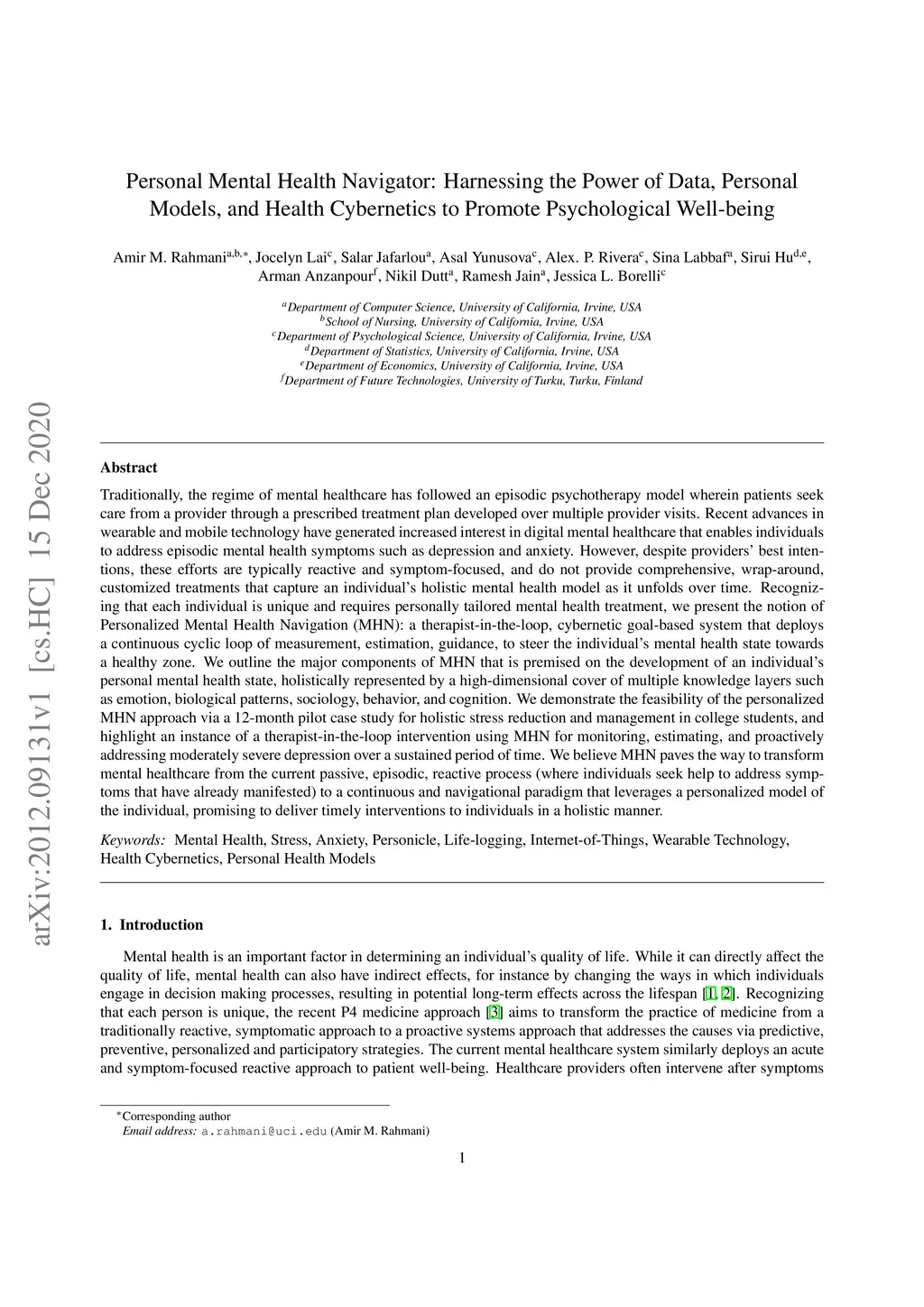 Traditionally, the regime of mental healthcare has followed an episodic psychotherapy model wherein patients seek care from a provider through a prescribed treatment plan developed over multiple provider visits. Recent advances in wearable and mobile technology have generated increased interest in digital mental healthcare that enables individuals to address episodic mental health symptoms. However, these efforts are typically reactive and symptom-focused and do not provide comprehensive, wrap-around, customized treatments that capture an individual's holistic mental health model as it unfolds over time. Recognizing that each individual is unique, we present the notion of Personalized Mental Health Navigation (MHN): a therapist-in-the-loop, cybernetic goal-based system that deploys a continuous cyclic loop of measurement, estimation, guidance, to steer the individual's mental health state towards a healthy zone. We outline the major components of MHN that is premised on the development of an individual's personal mental health state, holistically represented by a high-dimensional cover of multiple knowledge layers such as emotion, biological patterns, sociology, behavior, and cognition. We demonstrate the feasibility of the personalized MHN approach via a 12-month pilot case study for holistic stress management in college students and highlight an instance of a therapist-in-the-loop intervention using MHN for monitoring, estimating, and proactively addressing moderately severe depression over a sustained period of time. We believe MHN paves the way to transform mental healthcare from the current passive, episodic, reactive process (where individuals seek help to address symptoms that have already manifested) to a continuous and navigational paradigm that leverages a personalized model of the individual, promising to deliver timely interventions to individuals in a holistic manner.