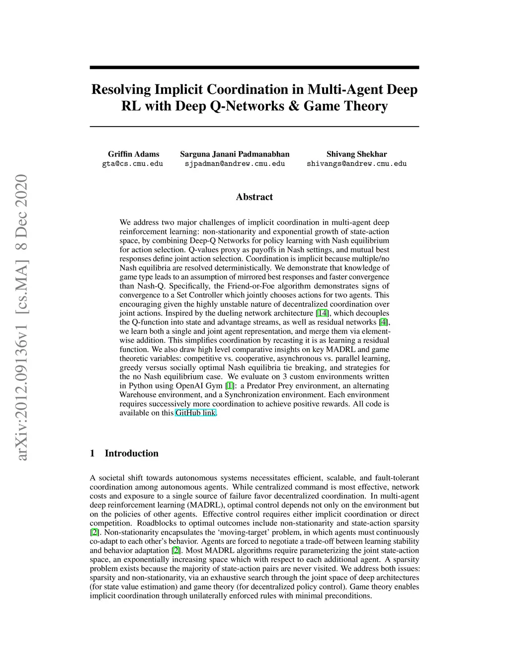 We address two major challenges of implicit coordination in multi-agent deep reinforcement learning: non-stationarity and exponential growth of state-action space, by combining Deep-Q Networks for policy learning with Nash equilibrium for action selection. Q-values proxy as payoffs in Nash settings, and mutual best responses define joint action selection. Coordination is implicit because multiple/no Nash equilibria are resolved deterministically. We demonstrate that knowledge of game type leads to an assumption of mirrored best responses and faster convergence than Nash-Q. Specifically, the Friend-or-Foe algorithm demonstrates signs of convergence to a Set Controller which jointly chooses actions for two agents. This encouraging given the highly unstable nature of decentralized coordination over joint actions. Inspired by the dueling network architecture, which decouples the Q-function into state and advantage streams, as well as residual networks, we learn both a single and joint agent representation, and merge them via element-wise addition. This simplifies coordination by recasting it is as learning a residual function. We also draw high level comparative insights on key MADRL and game theoretic variables: competitive vs. cooperative, asynchronous vs. parallel learning, greedy versus socially optimal Nash equilibria tie breaking, and strategies for the no Nash equilibrium case. We evaluate on 3 custom environments written in Python using OpenAI Gym: a Predator Prey environment, an alternating Warehouse environment, and a Synchronization environment. Each environment requires successively more coordination to achieve positive rewards.