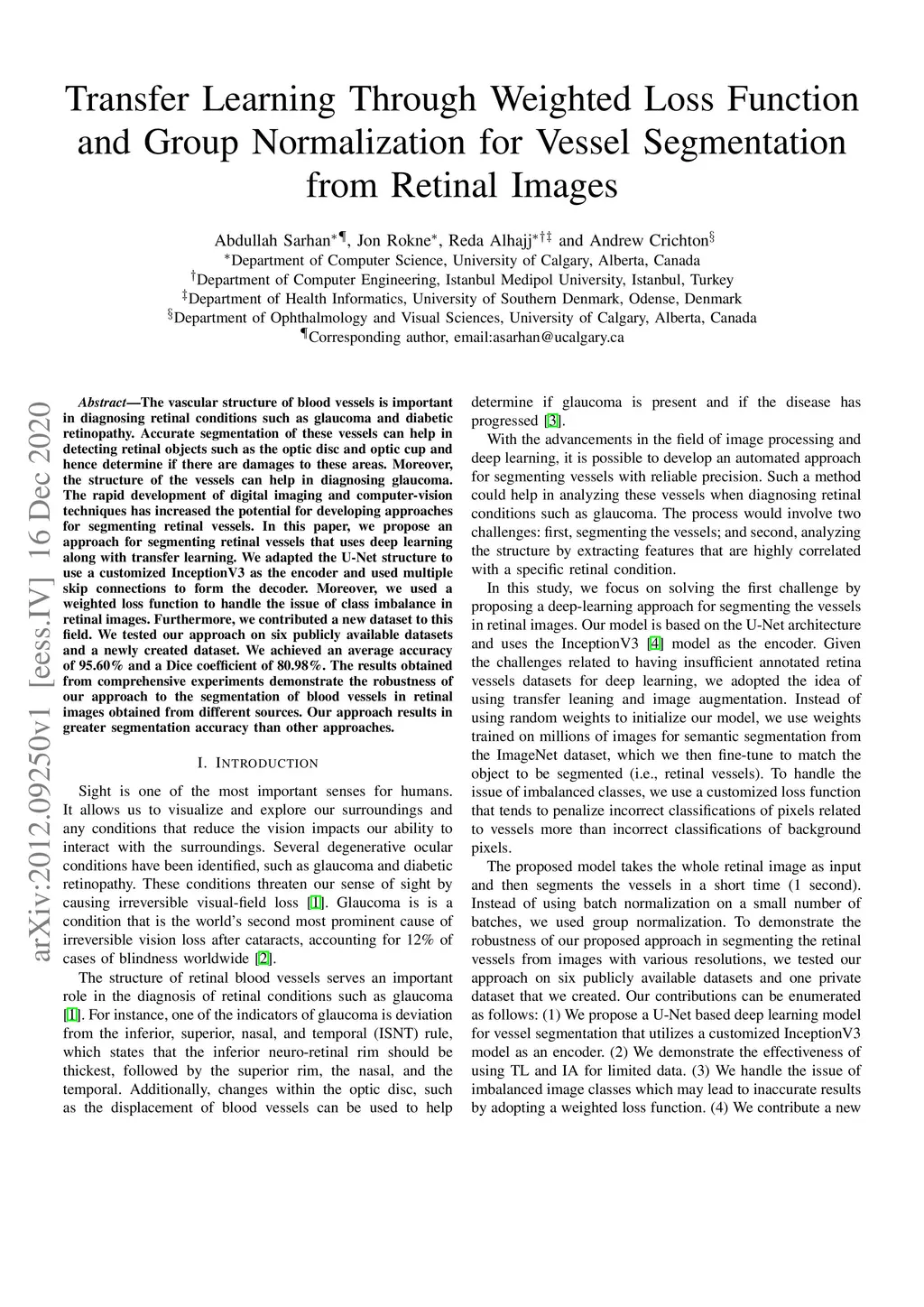 The vascular structure of blood vessels is important in diagnosing retinal conditions such as glaucoma and diabetic retinopathy. Accurate segmentation of these vessels can help in detecting retinal objects such as the optic disc and optic cup and hence determine if there are damages to these areas. Moreover, the structure of the vessels can help in diagnosing glaucoma. The rapid development of digital imaging and computer-vision techniques has increased the potential for developing approaches for segmenting retinal vessels. In this paper, we propose an approach for segmenting retinal vessels that uses deep learning along with transfer learning. We adapted the U-Net structure to use a customized InceptionV3 as the encoder and used multiple skip connections to form the decoder. Moreover, we used a weighted loss function to handle the issue of class imbalance in retinal images. Furthermore, we contributed a new dataset to this field. We tested our approach on six publicly available datasets and a newly created dataset. We achieved an average accuracy of 95.60% and a Dice coefficient of 80.98%. The results obtained from comprehensive experiments demonstrate the robustness of our approach to the segmentation of blood vessels in retinal images obtained from different sources. Our approach results in greater segmentation accuracy than other approaches.