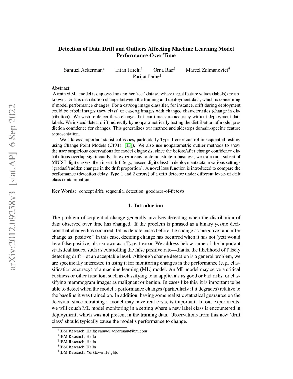 A trained ML model is deployed on another `test' dataset where target feature values (labels) are unknown. Drift is distribution change between the training and deployment data, which is concerning if model performance changes. For a cat/dog image classifier, for instance, drift during deployment could be rabbit images (new class) or cat/dog images with changed characteristics (change in distribution). We wish to detect these changes but can't measure accuracy without deployment data labels. We instead detect drift indirectly by nonparametrically testing the distribution of model prediction confidence for changes. This generalizes our method and sidesteps domain-specific feature representation. We address important statistical issues, particularly Type-1 error control in sequential testing, using Change Point Models (CPMs; see Adams and Ross 2012). We also use nonparametric outlier methods to show the user suspicious observations for model diagnosis, since the before/after change confidence distributions overlap significantly. In experiments to demonstrate robustness, we train on a subset of MNIST digit classes, then insert drift (e.g., unseen digit class) in deployment data in various settings (gradual/sudden changes in the drift proportion). A novel loss function is introduced to compare the performance (detection delay, Type-1 and 2 errors) of a drift detector under different levels of drift class contamination.