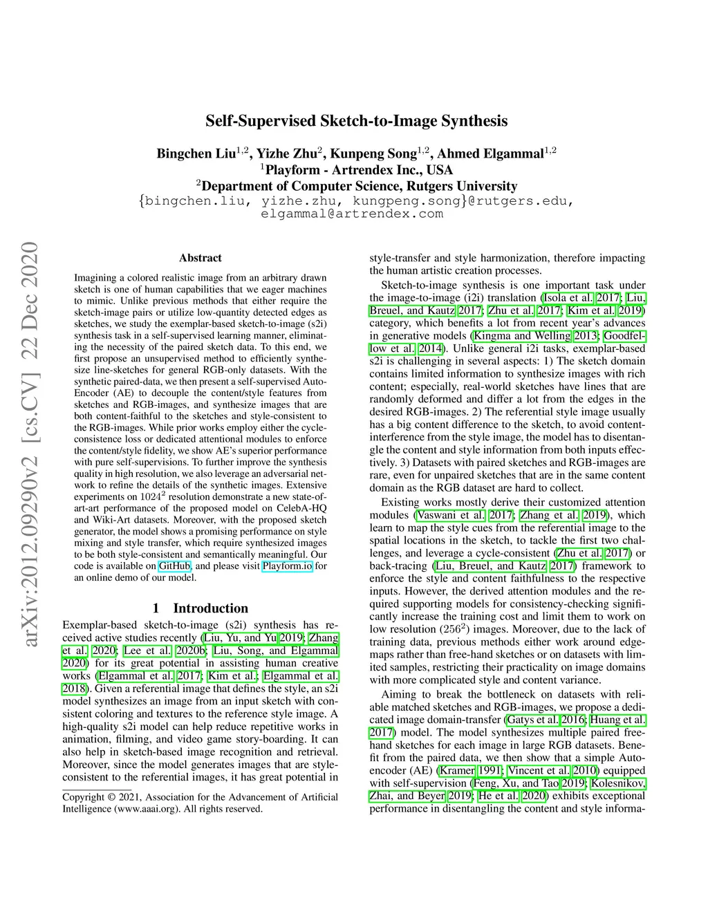 Imagining a colored realistic image from an arbitrarily drawn sketch is one of the human capabilities that we eager machines to mimic. Unlike previous methods that either requires the sketch-image pairs or utilize low-quantity detected edges as sketches, we study the exemplar-based sketch-to-image (s2i) synthesis task in a self-supervised learning manner, eliminating the necessity of the paired sketch data. To this end, we first propose an unsupervised method to efficiently synthesize line-sketches for general RGB-only datasets. With the synthetic paired-data, we then present a self-supervised Auto-Encoder (AE) to decouple the content/style features from sketches and RGB-images, and synthesize images that are both content-faithful to the sketches and style-consistent to the RGB-images. While prior works employ either the cycle-consistence loss or dedicated attentional modules to enforce the content/style fidelity, we show AE's superior performance with pure self-supervisions. To further improve the synthesis quality in high resolution, we also leverage an adversarial network to refine the details of synthetic images. Extensive experiments on 1024*1024 resolution demonstrate a new state-of-art-art performance of the proposed model on CelebA-HQ and Wiki-Art datasets. Moreover, with the proposed sketch generator, the model shows a promising performance on style mixing and style transfer, which require synthesized images to be both style-consistent and semantically meaningful. Our code is available on https://github.com/odegeasslbc/Self-Supervised-Sketch-to-Image-Synthesis-PyTorch, and please visit https://create.playform.io/my-projects?mode=sketch for an online demo of our model.