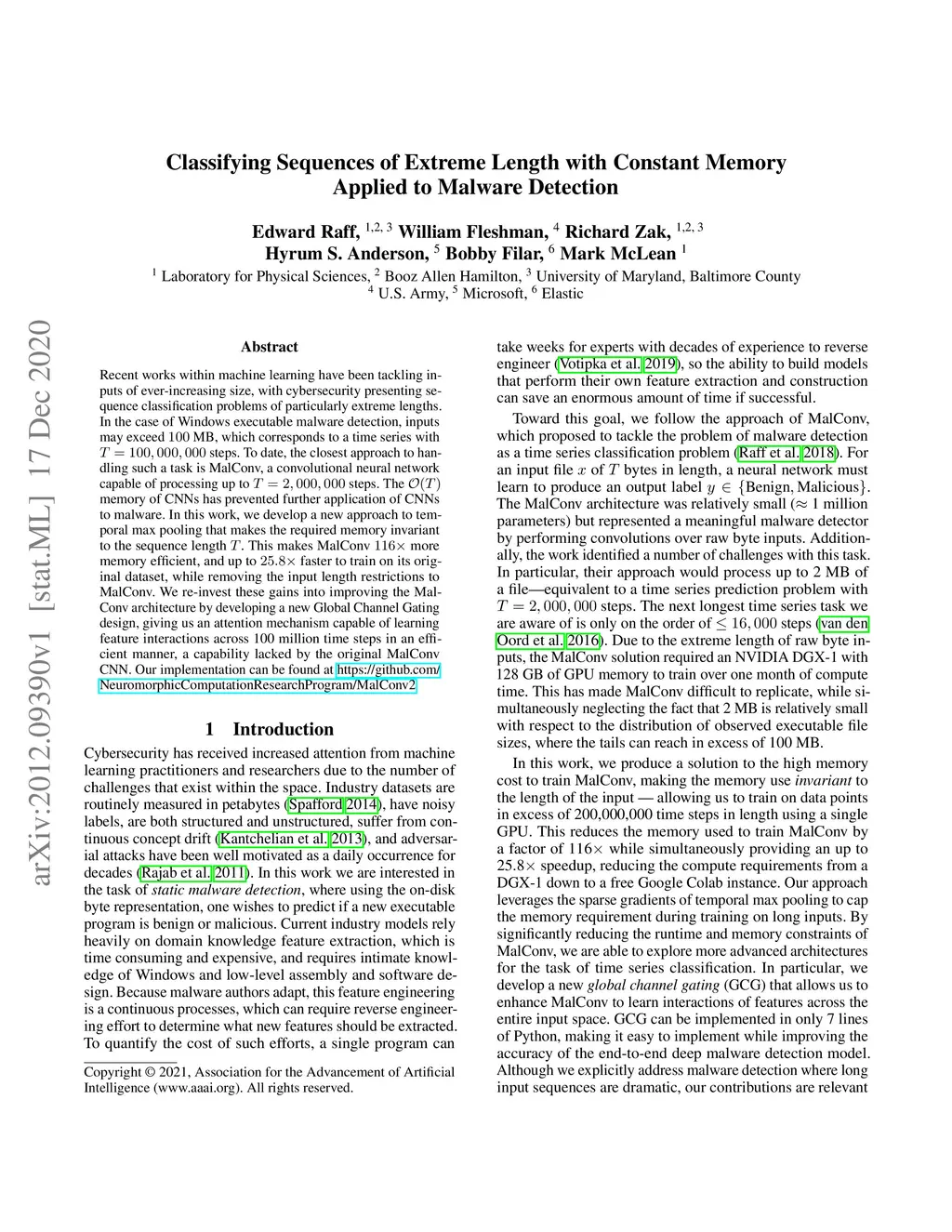 Recent works within machine learning have been tackling inputs of ever-increasing size, with cybersecurity presenting sequence classification problems of particularly extreme lengths. In the case of Windows executable malware detection, inputs may exceed MB, which corresponds to a time series with steps. To date, the closest approach to handling such a task is MalConv, a convolutional neural network capable of processing up to steps. The memory of CNNs has prevented further application of CNNs to malware. In this work, we develop a new approach to temporal max pooling that makes the required memory invariant to the sequence length . This makes MalConv more memory efficient, and up to faster to train on its original dataset, while removing the input length restrictions to MalConv. We re-invest these gains into improving the MalConv architecture by developing a new Global Channel Gating design, giving us an attention mechanism capable of learning feature interactions across 100 million time steps in an efficient manner, a capability lacked by the original MalConv CNN. Our implementation can be found at https://github.com/NeuromorphicComputationResearchProgram/MalConv2