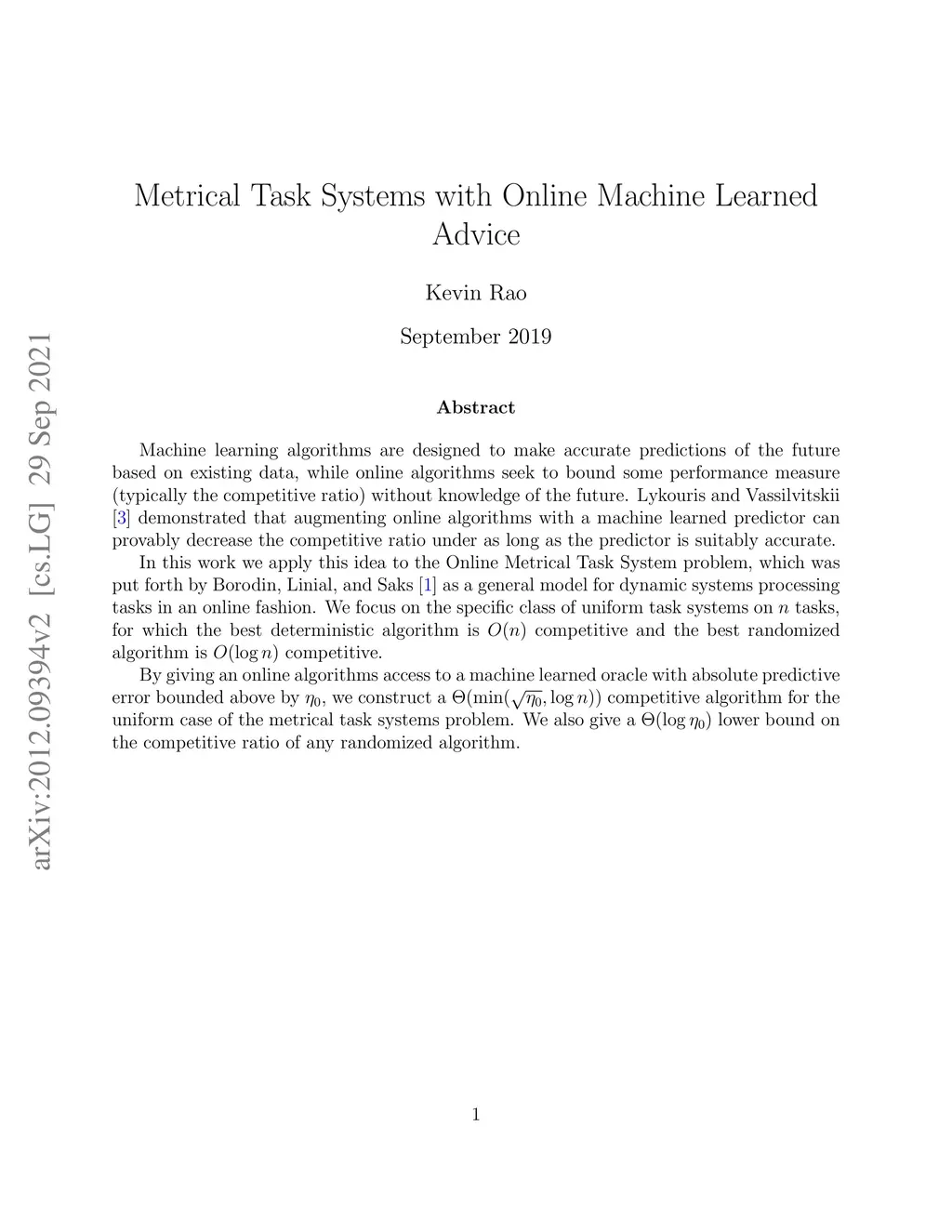 Machine learning algorithms are designed to make accurate predictions of the future based on existing data, while online algorithms seek to bound some performance measure (typically the competitive ratio) without knowledge of the future. Lykouris and Vassilvitskii demonstrated that augmenting online algorithms with a machine learned predictor can provably decrease the competitive ratio under as long as the predictor is suitably accurate. In this work we apply this idea to the Online Metrical Task System problem, which was put forth by Borodin, Linial, and Saks as a general model for dynamic systems processing tasks in an online fashion. We focus on the specific class of uniform task systems on tasks, for which the best deterministic algorithm is competitive and the best randomized algorithm is competitive. By giving an online algorithms access to a machine learned oracle with absolute predictive error bounded above by , we construct a competitive algorithm for the uniform case of the metrical task systems problem. We also give a lower bound on the competitive ratio of any randomized algorithm.