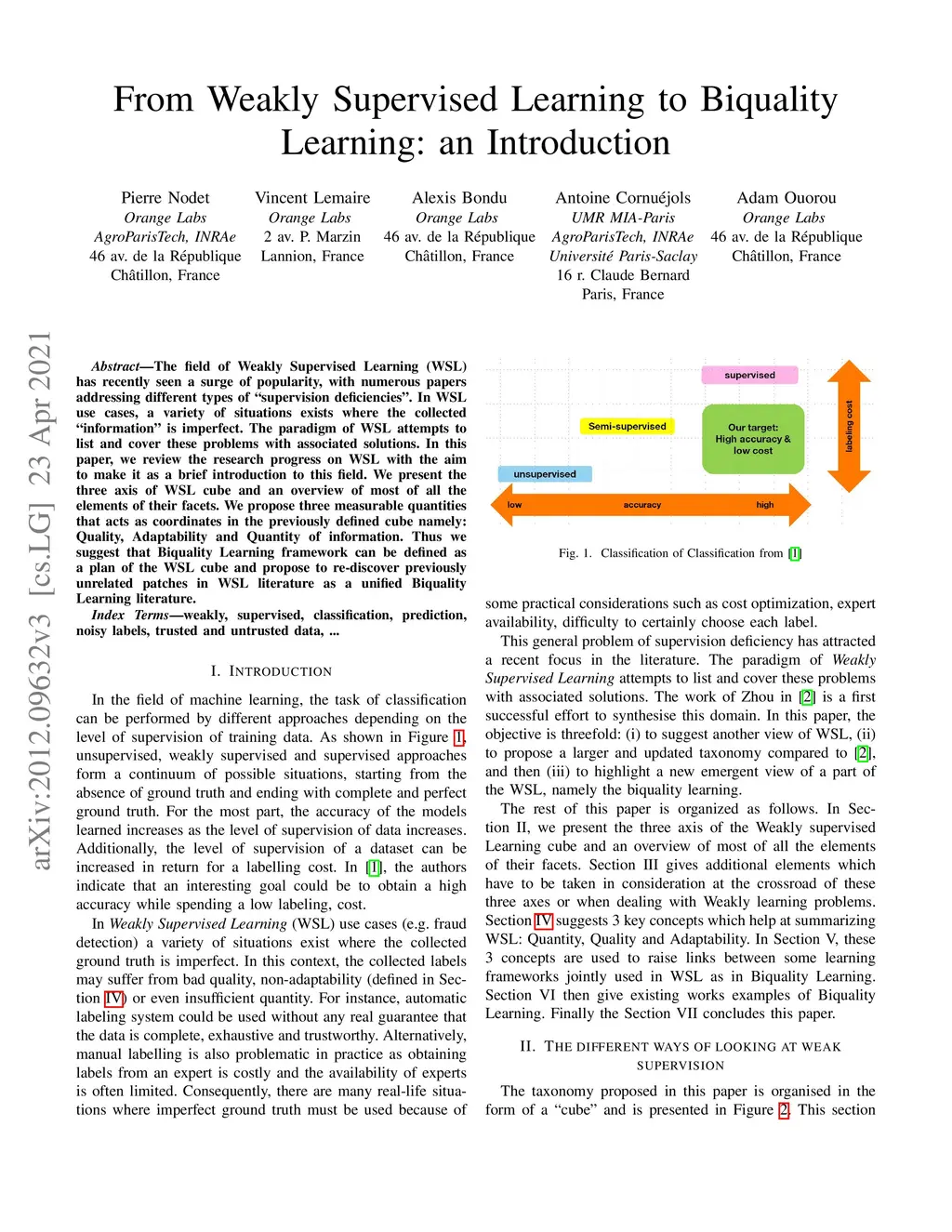 The field of Weakly Supervised Learning (WSL) has recently seen a surge of popularity, with numerous papers addressing different types of "supervision deficiencies". In WSL use cases, a variety of situations exists where the collected "information" is imperfect. The paradigm of WSL attempts to list and cover these problems with associated solutions. In this paper, we review the research progress on WSL with the aim to make it as a brief introduction to this field. We present the three axis of WSL cube and an overview of most of all the elements of their facets. We propose three measurable quantities that acts as coordinates in the previously defined cube namely: Quality, Adaptability and Quantity of information. Thus we suggest that Biquality Learning framework can be defined as a plan of the WSL cube and propose to re-discover previously unrelated patches in WSL literature as a unified Biquality Learning literature.