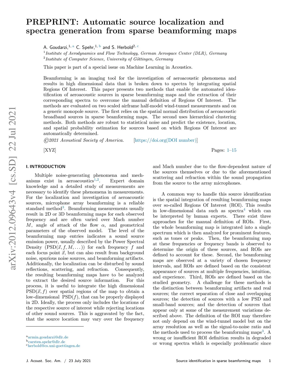Beamforming is an imaging tool for the investigation of aeroacoustic phenomena and results in high dimensional data that is broken down to spectra by integrating spatial Regions Of Interest. This paper presents two methods that enable the automated identification of aeroacoustic sources in sparse beamforming maps and the extraction of their corresponding spectra to overcome the manual definition of Regions Of Interest. The methods are evaluated on two scaled airframe half-model wind-tunnel measurements and on a generic monopole source. The first relies on the spatial normal distribution of aeroacoustic broadband sources in sparse beamforming maps. The second uses hierarchical clustering methods. Both methods are robust to statistical noise and predict the existence, location, and spatial probability estimation for sources based on which Regions Of Interest are automatically determined.