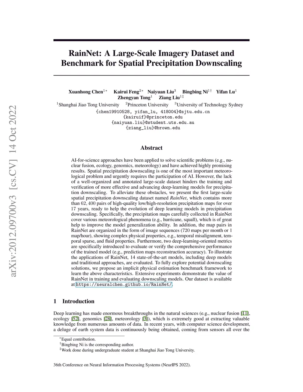 AI-for-science approaches have been applied to solve scientific problems (e.g., nuclear fusion, ecology, genomics, meteorology) and have achieved highly promising results. Spatial precipitation downscaling is one of the most important meteorological problem and urgently requires the participation of AI. However, the lack of a well-organized and annotated large-scale dataset hinders the training and verification of more effective and advancing deep-learning models for precipitation downscaling. To alleviate these obstacles, we present the first large-scale spatial precipitation downscaling dataset named RainNet, which contains more than pairs of high-quality low/high-resolution precipitation maps for over years, ready to help the evolution of deep learning models in precipitation downscaling. Specifically, the precipitation maps carefully collected in RainNet cover various meteorological phenomena (e.g., hurricane, squall), which is of great help to improve the model generalization ability. In addition, the map pairs in RainNet are organized in the form of image sequences ( maps per month or 1 map/hour), showing complex physical properties, e.g., temporal misalignment, temporal sparse, and fluid properties. Furthermore, two deep-learning-oriented metrics are specifically introduced to evaluate or verify the comprehensive performance of the trained model (e.g., prediction maps reconstruction accuracy). To illustrate the applications of RainNet, 14 state-of-the-art models, including deep models and traditional approaches, are evaluated. To fully explore potential downscaling solutions, we propose an implicit physical estimation benchmark framework to learn the above characteristics. Extensive experiments demonstrate the value of RainNet in training and evaluating downscaling models. Our dataset is available at https://neuralchen.github.io/RainNet/.